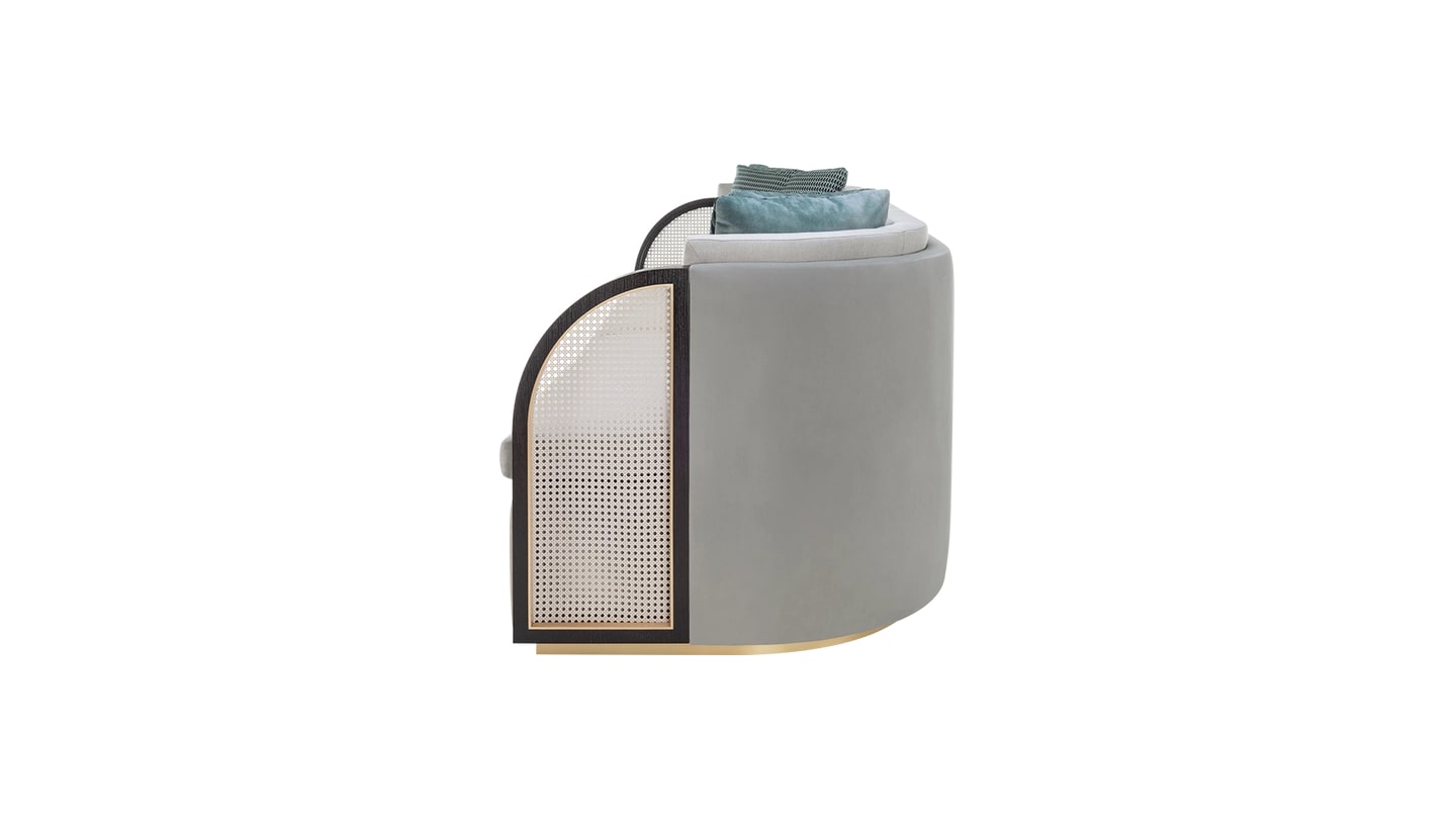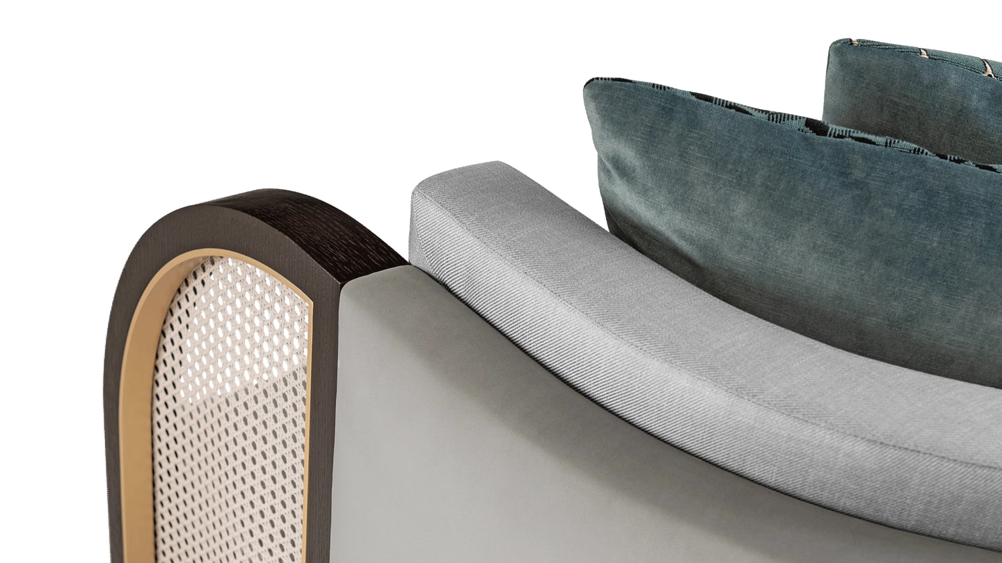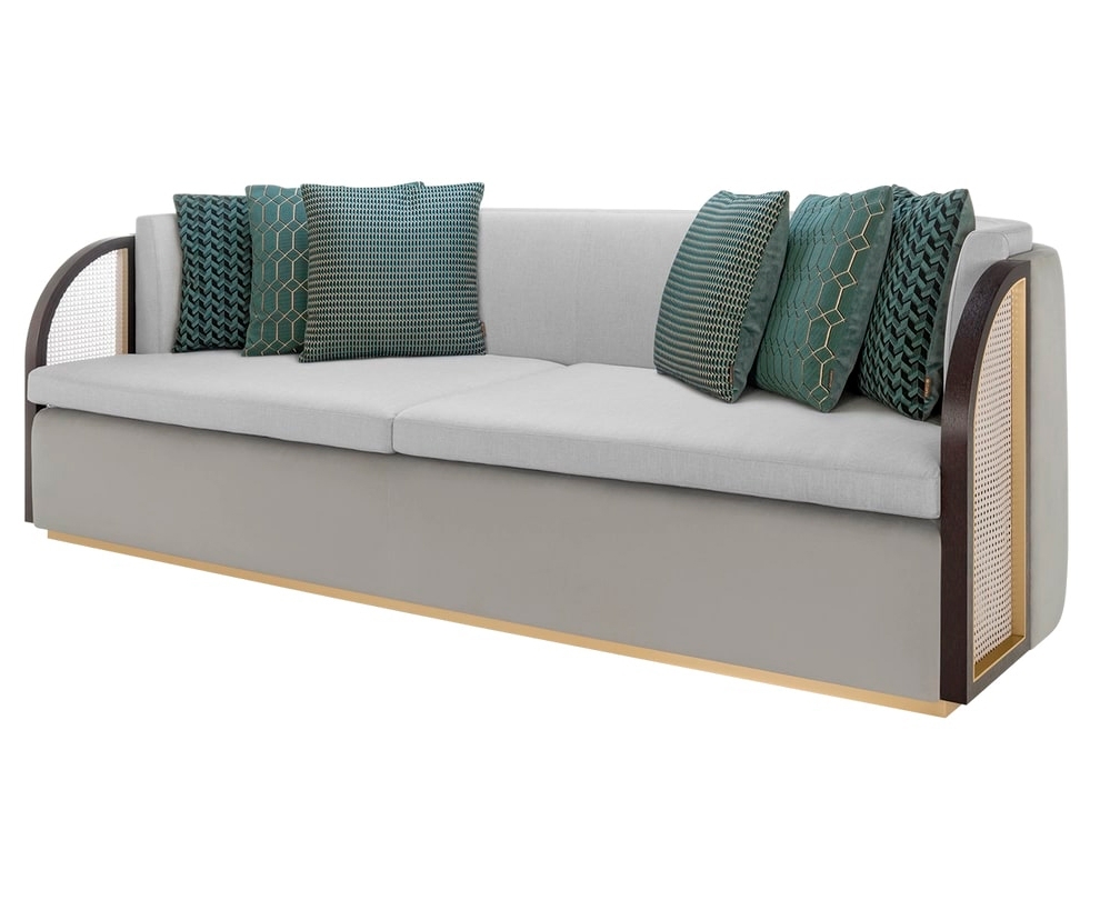 "Столь же привлекательный, как Вечный город, диван ROME манит вас изогнутыми подлокотниками, дополненными характерными панелями из ротанга. Она отделана бархатом и льном, что делает ее невероятно уютной."