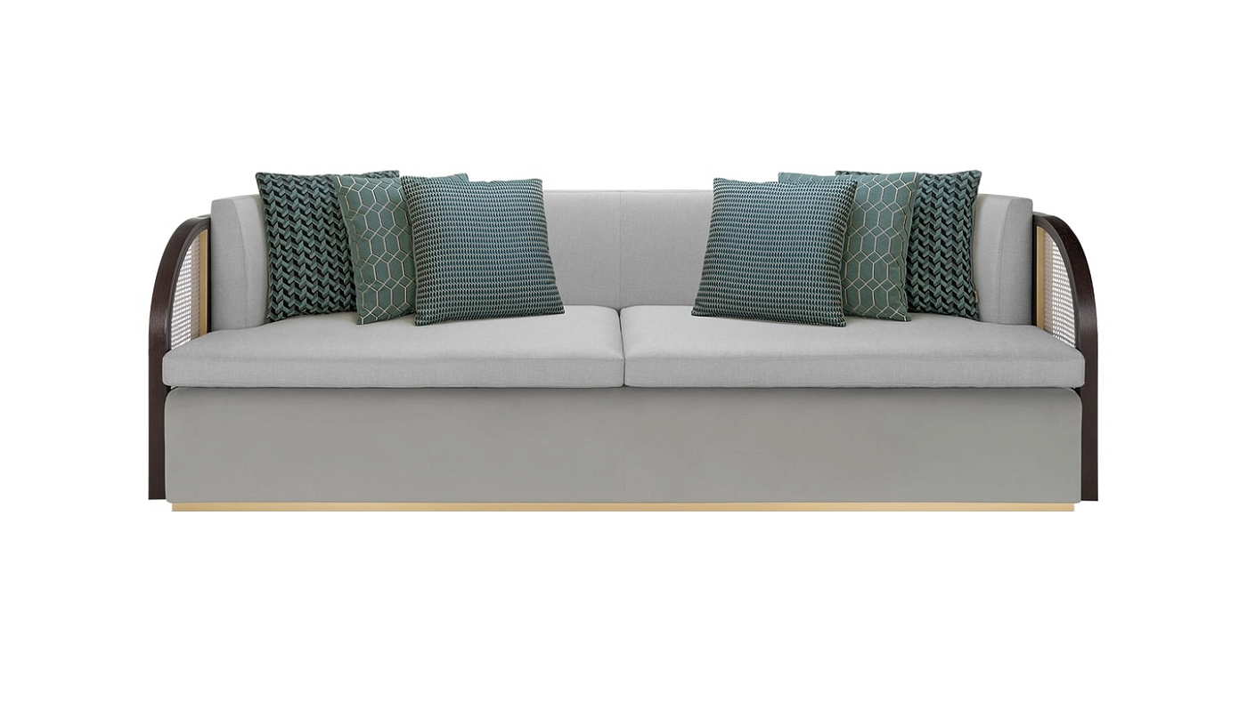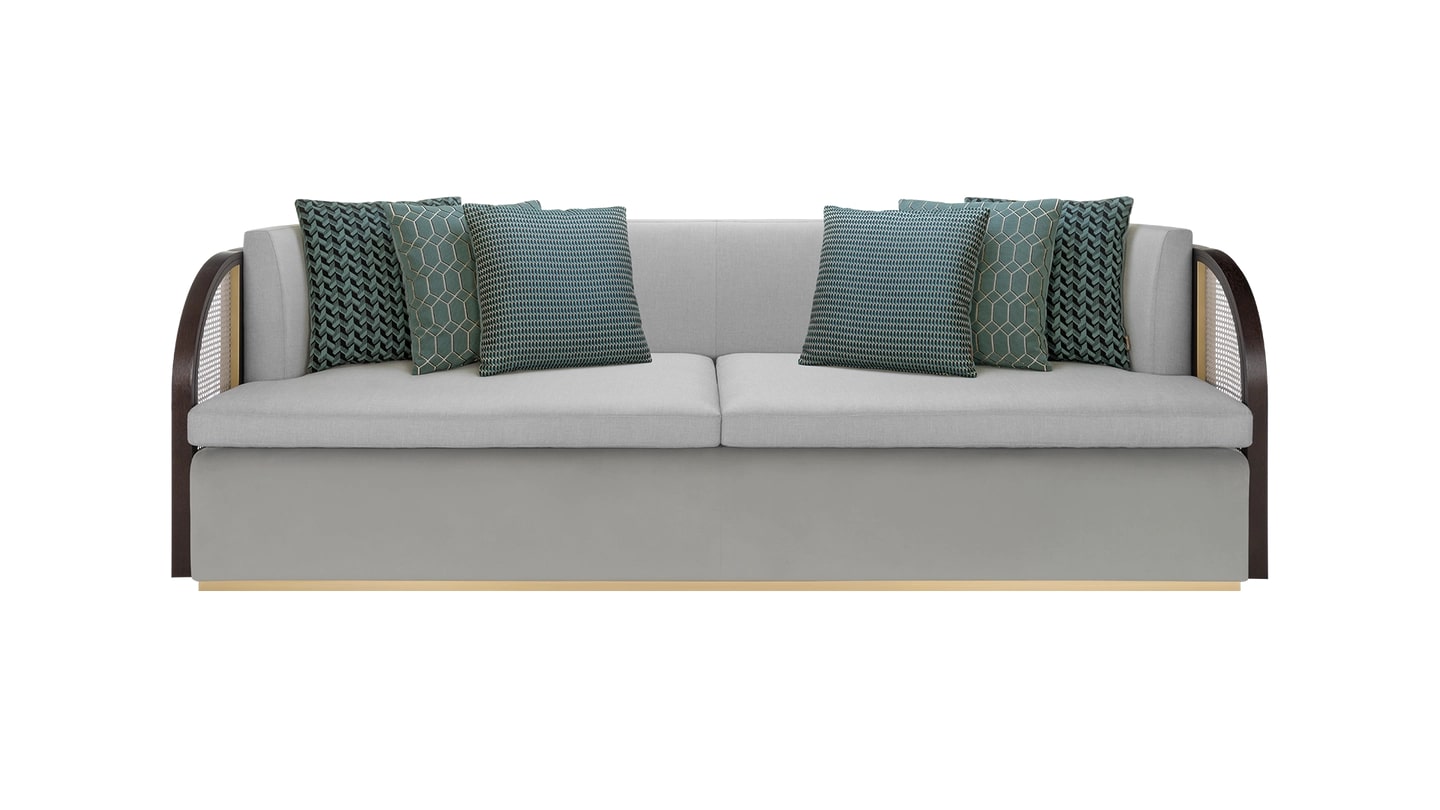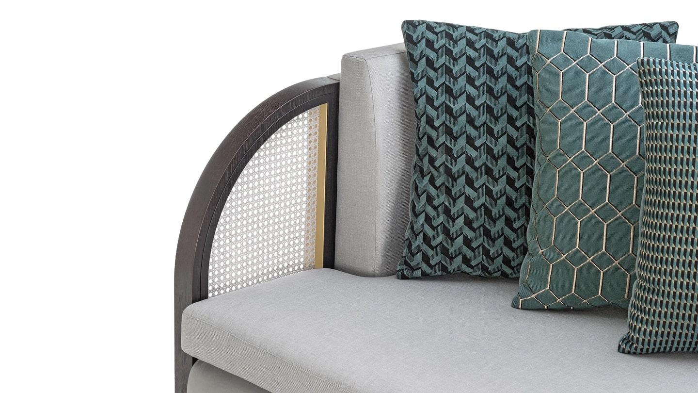 "Столь же привлекательный, как Вечный город, диван ROME манит вас изогнутыми подлокотниками, дополненными характерными панелями из ротанга. Она отделана бархатом и льном, что делает ее невероятно уютной."