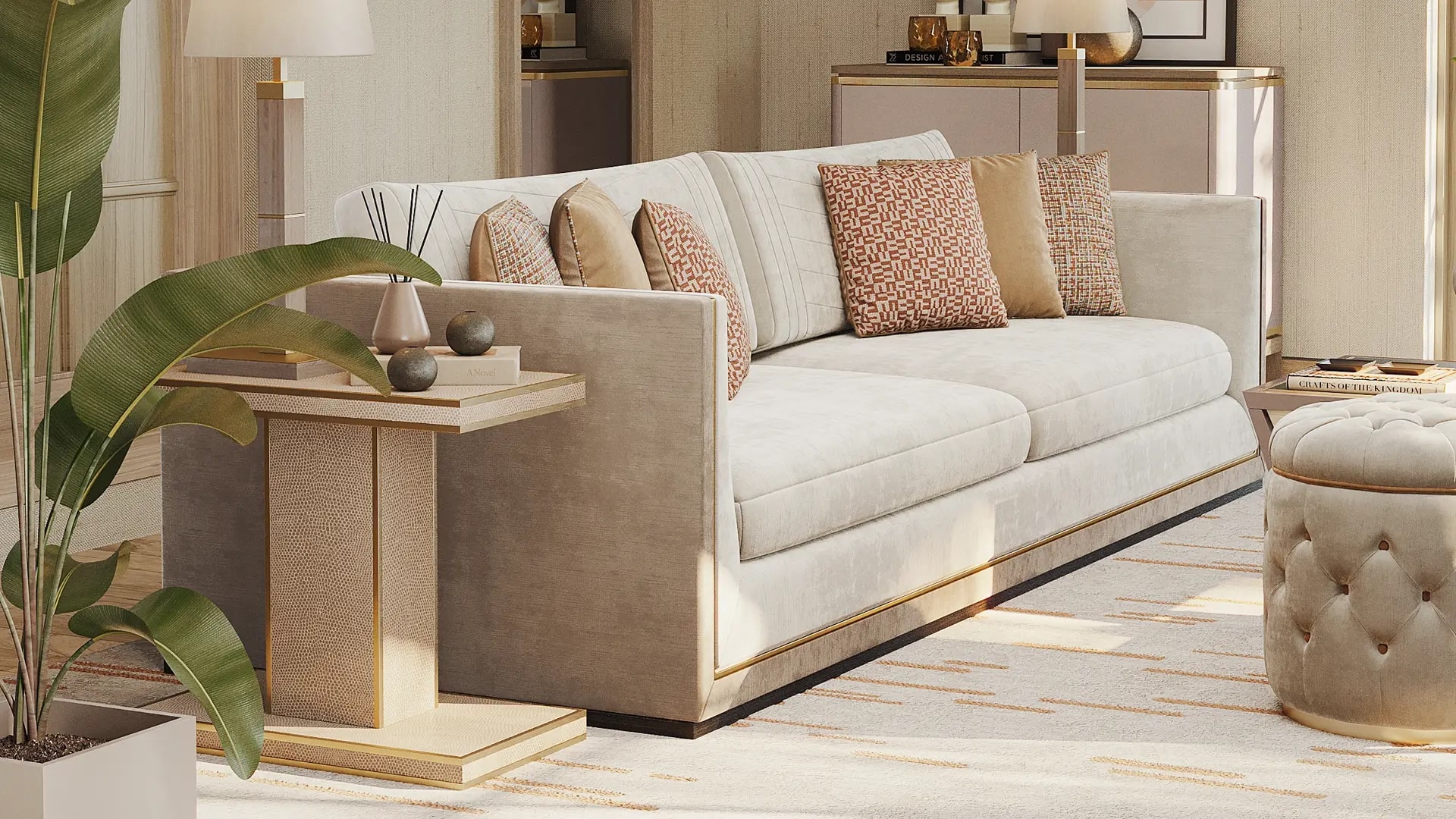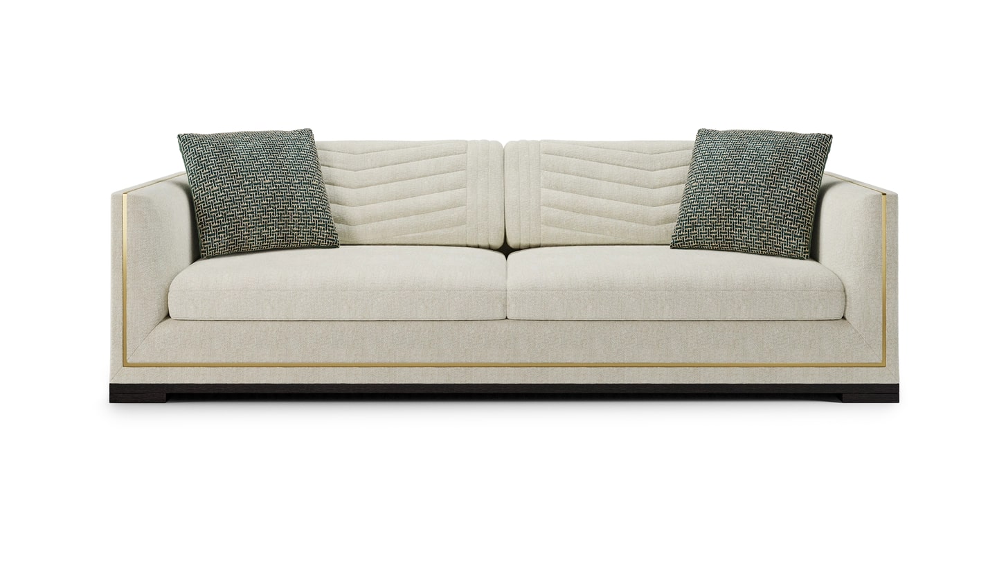 Прямой классический диван SALZBOURG с идеальными пропорциями придает характер своему безупречному силуэту тонкими чертами. Обратите внимание на шевронную строчку на подушке спинки, металлическую полоску, обрамляющую дизайн, и тонкое деревянное основание, придающее ощущение солидности.