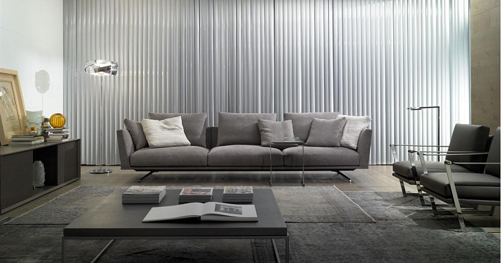 Коллекция Shelby задумана как линейный продукт, который визуально парит над землей. Весь его объем поддерживается только тонкими ножками, а его кажущаяся тонкая металлическая рама позволяет создавать диваны длиной более трех метров. В коллекции представлены многочисленные модули, а также шезлонги и пуфы для создания всевозможных композиций. Каркас изготовлен из стали и дерева. В качестве наполнителей используются высококачественный пенополиуретан различной плотности, утиное перо и синтетическое волокно. Доступен практически в любом цвете, для обивки может быть использована ткань, натуральная или искусственная кожа. Полностью съемные чехлы (если обивка из ткани) позволяют в любой момент изменить цвет обивки или заметить ее в случае повреждения. Версия Shelby Class позволяет размещать один и тот же диван в более современных условиях, используя то же техническое разрешение, но добавляя детали нижнего волана, что придает немного другой вид тому же дивану.