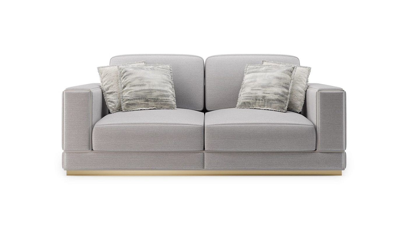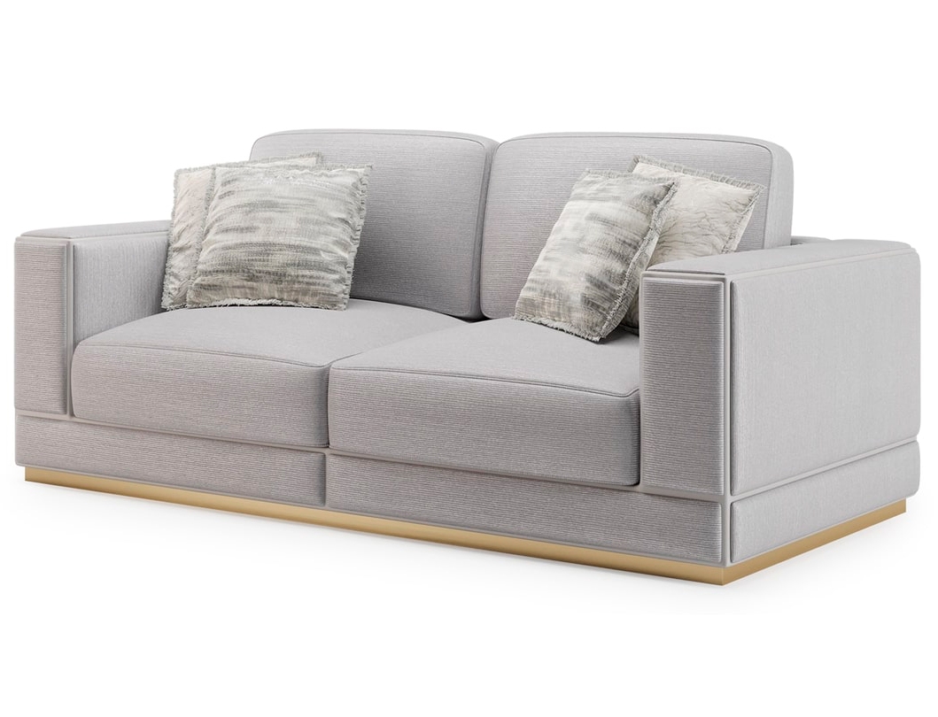 Двухместный диван WINDSOR с чистой обивкой и современным дизайном в стиле Лоусона включает в себя несколько неожиданных деталей дизайна. Они включают в себя панели из тканой ткани, наложенные поверх гладкого атласа, и изящную основу из матовой латуни.