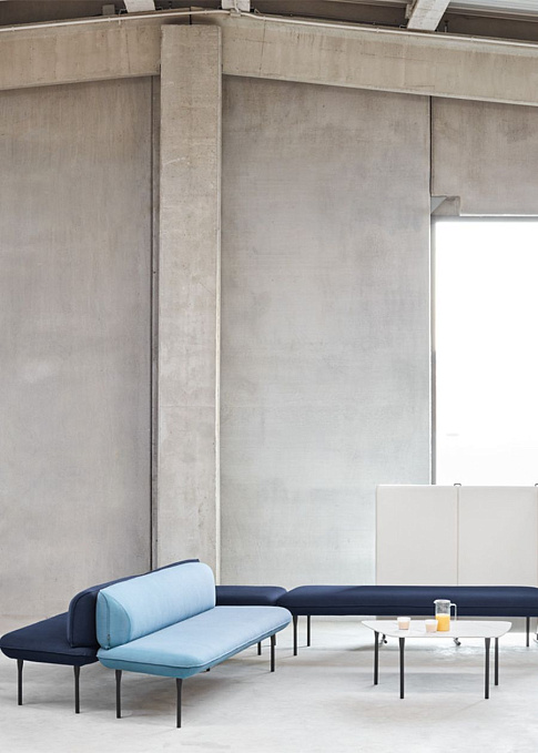 Короткий обитый модуль сиденья с небольшой спинкой (A) и металлическими ножками. Insula — это модульная система диванов, состоящая из двух размеров сиденья (короткого и длинного) и 3 спинок (A, B и C), объединенных и соединенных вместе со столешницей разных форм и материалов.>