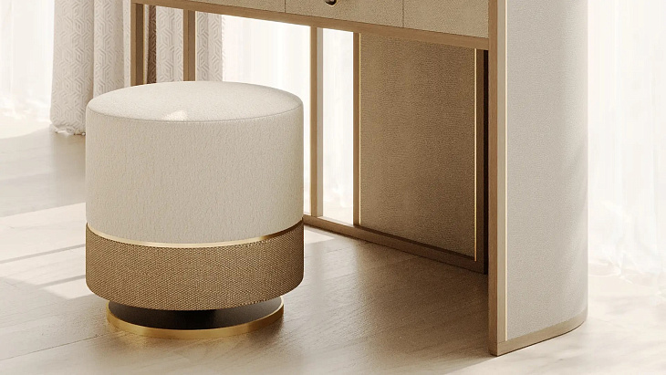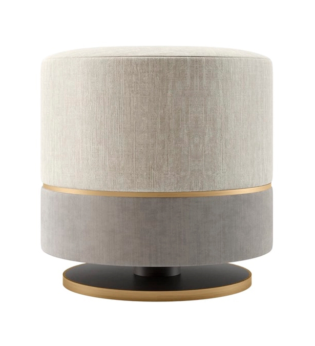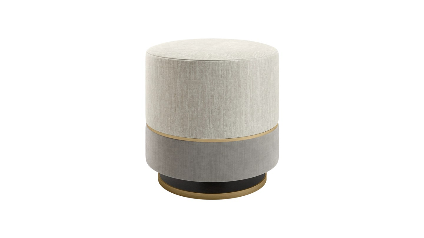 Табурет PARMA с урезанной спинкой подчеркивает свой сдержанный силуэт за счет сочетания контрастных тканей, разделенных полосой из матовой латуни.