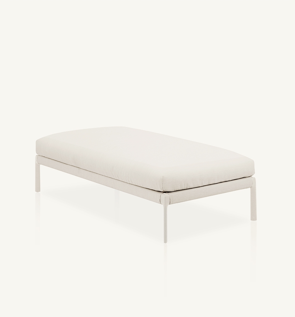 Подставка для ног со структурой из высокопрочного алюминиевого профиля и ножками из литого алюминия, покрытого полиэфирным порошком. Возможность персонализации благодаря широкому выбору технических тканей, полностью подходящих для использования на открытом воздухе. Съемный мягкий чехол.