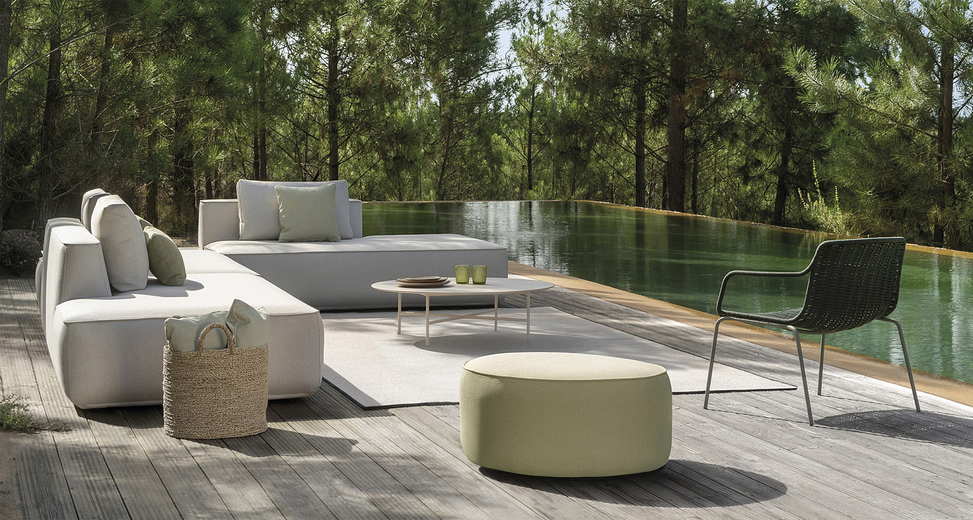 Модульная коллекция изготовлена из высокопрочной алюминиевой трубки и обитая пеной различной плотности. Возможность настройки с помощью широкого спектра технических тканей, полностью подходящих для наружного использования.