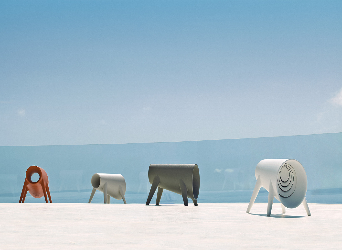 Bum Bum был рожден из принципа не конструирования предметов, а скорее музыкальных инструментов, которые будут использоваться для другой цели; то же самое, что человек, который держит раковину к уху, чтобы услышать океан. Эта коллекция, имеющая трубчатые формы, позволяет нам экспериментировать со светом и звуком одновременно. Его "аргонавтическая" форма позволяет нам создавать новую среду обитания, а также атмосферные пространства, где бы мы ни находились. Коллекция состоит из дивана, стола, кресла и”Торо " (быка), уникального элемента с большим разнообразием функций. Это коллекция, предназначенная для Бога моря, Нептуна и русалок, которые танцуют в такт волнам...Это так просто ... летний сон.