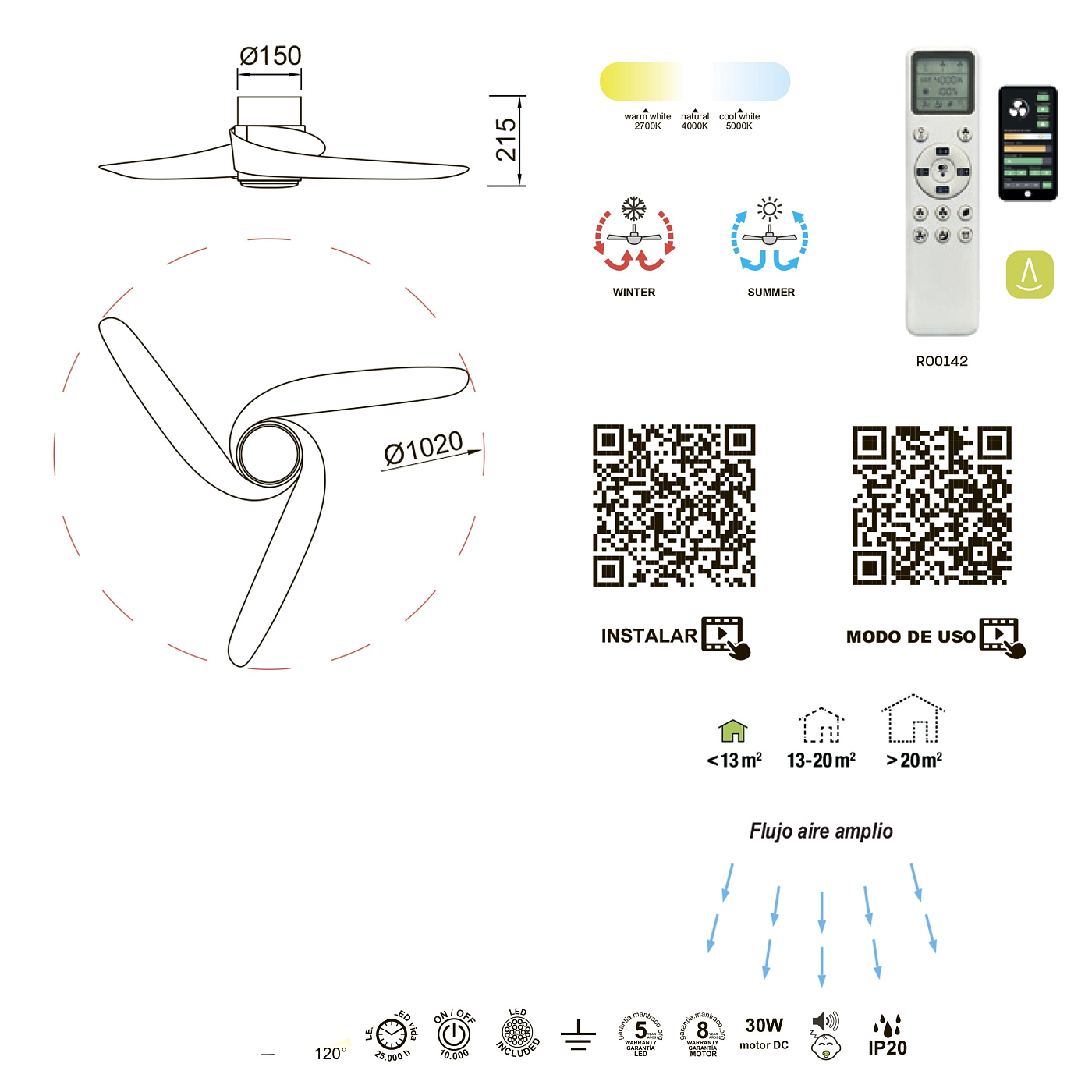 GROENLAND - это минималистичный, но мультифункциональный предмет интерьера. С этой коллекцией Mantra привносит инновации в сектор вентиляционных элементов, добавляя оригинальность и изобретательность с помощью дизайна. Светильник GROENLAND способен обеспечить прохладную вентиляцию и обогрев, также как и эффектное освещение комнаты. В то время как вентилятор является идеальным дополнением к любому интерьеру в летнее время, “инверторная функция” (в положении встречного вращения) позволяет собрать горячий воздух и равномерно распределить его по комнате зимой. Коллекция идеально подходит для спален, благодаря своему тихому, но эффективному двигателю. GROENLAND впишется в спокойные и размеренные интерьеры с фокусом на функциональности и минимализме. Кроме того, благодаря возможности GROENLAND устанавливать различные интенсивности света и вентиляции, он может быть размещен в больших помещениях, таких как гостиная или офис, кухня или игровая зона. Все настройки могут быть изменены с помощью пульта дистанционного управления. Выпускаются в трех вариантах цвета: белый, черный, под дерево.
