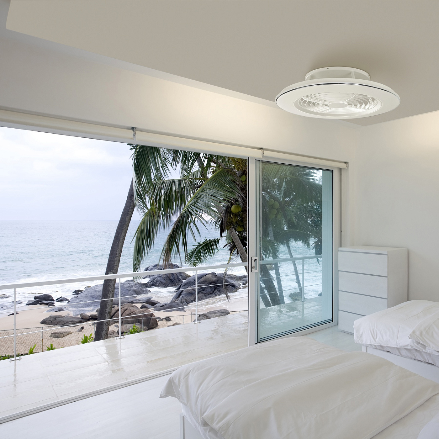 Потолочный вентилятор-светильник Alisio, выполненный из акрила, собирает в себе все лучшее из вентиляции и света в фантастическую и эстетическую реальность. Его минималистический стиль способен охватить его различные функции: освежающий, проветривающий, разогревающий, диммируемый, с возможностью изменения цвета и температуры. Возможно управление с пульта, а так же через Bluetooth с мобильного телефона.