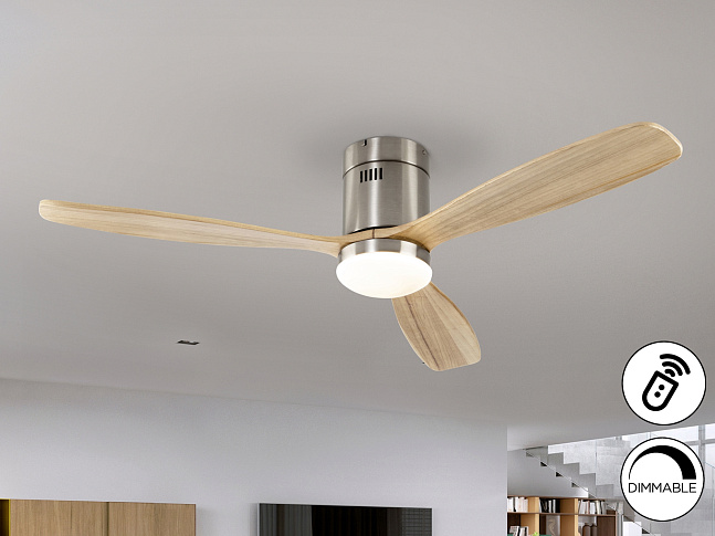 Потолочный вентилятор со светодиодной подсветкой. Диммируемый. Изготовлен из металла с матовым никелевым покрытием, лезвия из дерева, натуральная отделка. Рассеиватель из опалового стекла. Вентилятор с 6-скоростным реверсивным двигателем постоянного тока. Светодиод CCT трехцветной цветовой температуры. Таймер. Пульт дистанционного управления в комплекте. 24 Вт 1980 лм, светодиод, 3000К/4000К/5000К. Двигатель постоянного тока мощностью 22 Вт с 6 скоростями. Вентилятор: 3-лопастной, Ø132 см. 6 скоростей (100/120/140/160/180/200 об/мин), Расход воздуха (167/245/348/563/593/618 м3/ч). Движение реверсивное. Шум: 38-45Дб.