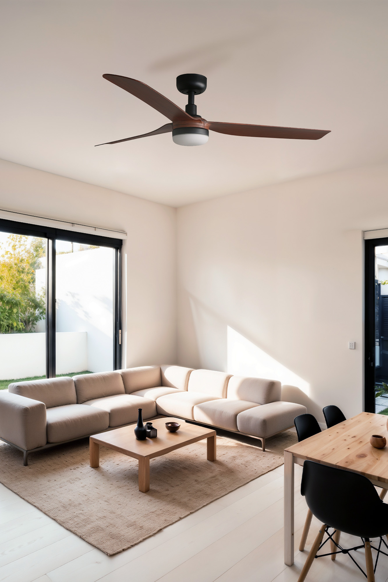 ПУНТ — потолочный вентилятор с подсветкой черного цвета и лопастей из темного дерева для помещений площадью от 13 м² до 17,6 м². Управляется с помощью пульта дистанционного управления с програматором, который входит в комплект. Этот потолочный вентилятор с электродвигателем постоянного тока с низким потреблением имеет 6 регулируемых скоростей. ПУНТ имеет функцию реверса лето-зима, поэтому вы можете использовать его и зимой, повышая эфективность вашей системы отопления. Подходит для наклонного потолка.