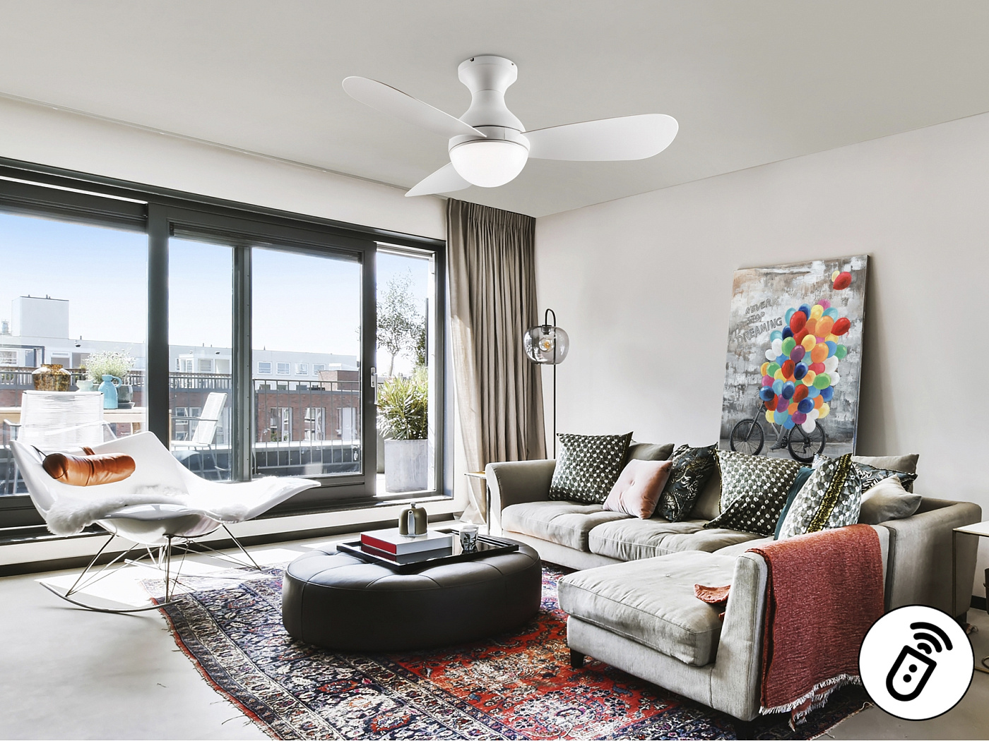 Потолочный вентилятор со светодиодной подсветкой CCT, изготовлен из металла с матовой белой отделкой и лопастями из глянцевого белого акрила. Опаловый акриловый рассеиватель. Двигатель постоянного тока 6 скоростей и реверс, 3 цветовых температуры. Таймер. Пульт дистанционного управления в комплекте. Светодиод 24 Вт, 1920 лм, 3000-6000 К. Вентилятор: 3-х лопастной пропеллер, выдвинутый Ø117 см. Радиус действия: Ø180 см (измеряется на 140 см ниже вентилятора). Двигатель постоянного тока 35 Вт. 6 скоростей. Обратное движение.