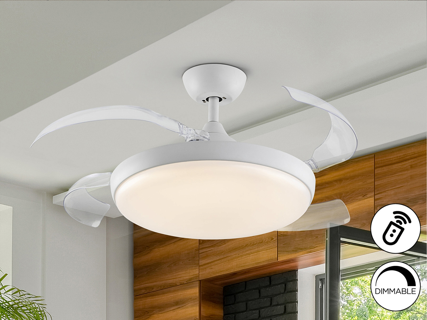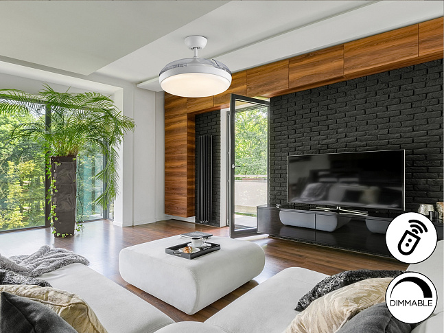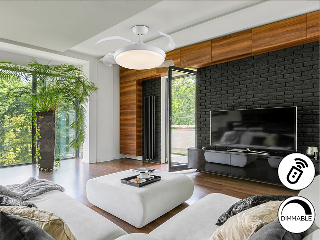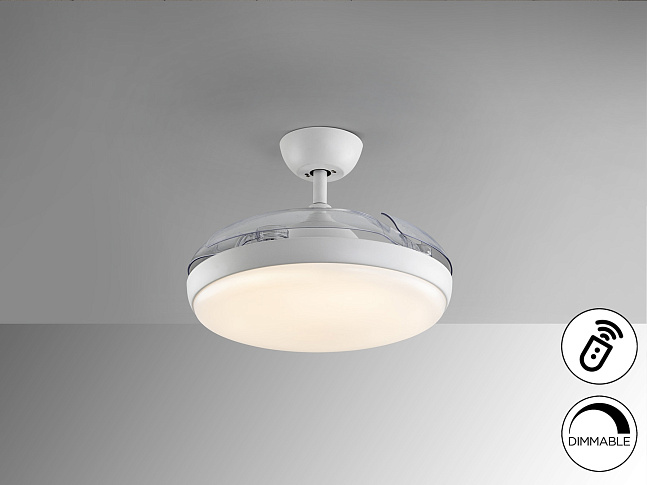 Потолочный вентилятор, светодиодная подсветка с регулируемой яркостью и CCT (регулируемая температура света), изготовлен из металла с матовой белой отделкой, рассеиватель из опалового акрила и прозрачные выдвижные лопасти. Двигатель постоянного тока 6-скоростной и реверс. Таймер, ветер и функция памяти. Пульт дистанционного управления в комплекте. Светодиод мощностью 36 Вт. 1830 лм, 2700-4000-5000 к. Вентилятор: 4-лопастной пропеллер, удлиненный Ø106 см. Двигатель постоянного тока мощностью 35 Вт. 6 скоростей (185/200/210/225/245/265 об/мин). Расход воздуха (215/400/593/741/889/949 м3/ч). Обратное движение. Слух: от 37 до 42 Дб.