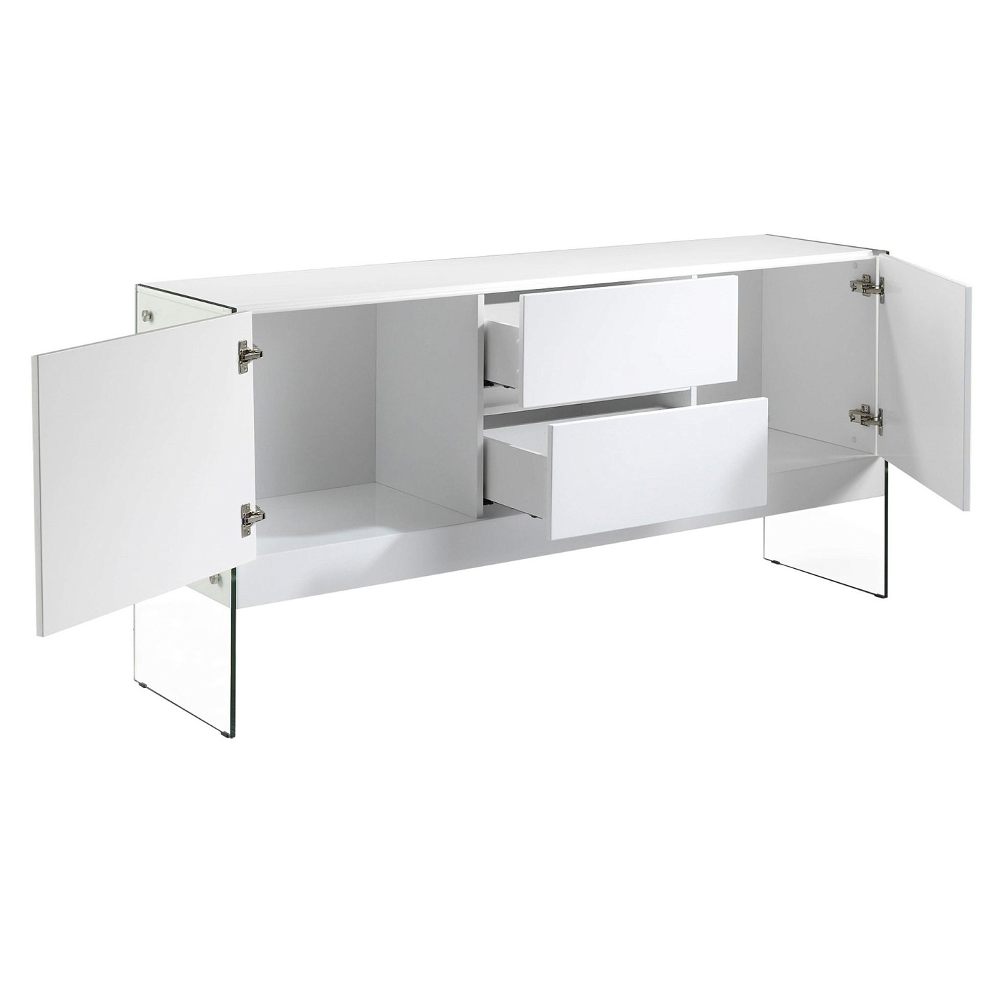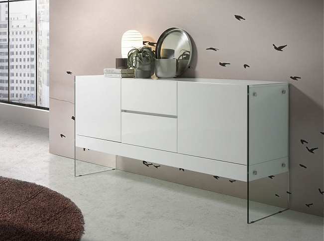 Сервант CP1410-E от фабрики Angel Cerda — беспроигрышный вариант для любого современного интерьера. С первого взгляда сервант убеждает в своей способности идеально вписаться в любой городской интерьер. Стеклянные опоры практически незаметны, за счет чего акцентируется только каркас. Сделанный из одного материала и простой по своей форме, он легко «подружится» с другими предметами интерьера в квартире с европейским модерном. Этот сервант представлен в двух моделях — BLANCO (выполнена из белого глянцевого МДФ) и NOGAL (произведена из шпона орехового дерева). Конструкция изделия предусматривает каркас, состоящий из четырех отделений. Справа и слева — две секции на дверцах, а в центре — два выдвижных ящика. Ручки отсутствуют, так как вместо них — доводчики на открывание и закрывание. По бокам к серванту прикручены две стойки из закаленного ударопрочного стекла. Каждая панель держится на четырех металлических крепежах, что обеспечивает надежность и прочность всей конструкции. Размеры серванта: ширина — 180 см, высота — 85 см, глубина — 45 см. Вес составляет 95 кг. Потребуется самостоятельная сборка. Инструкция и крепеж входят в комплектацию.