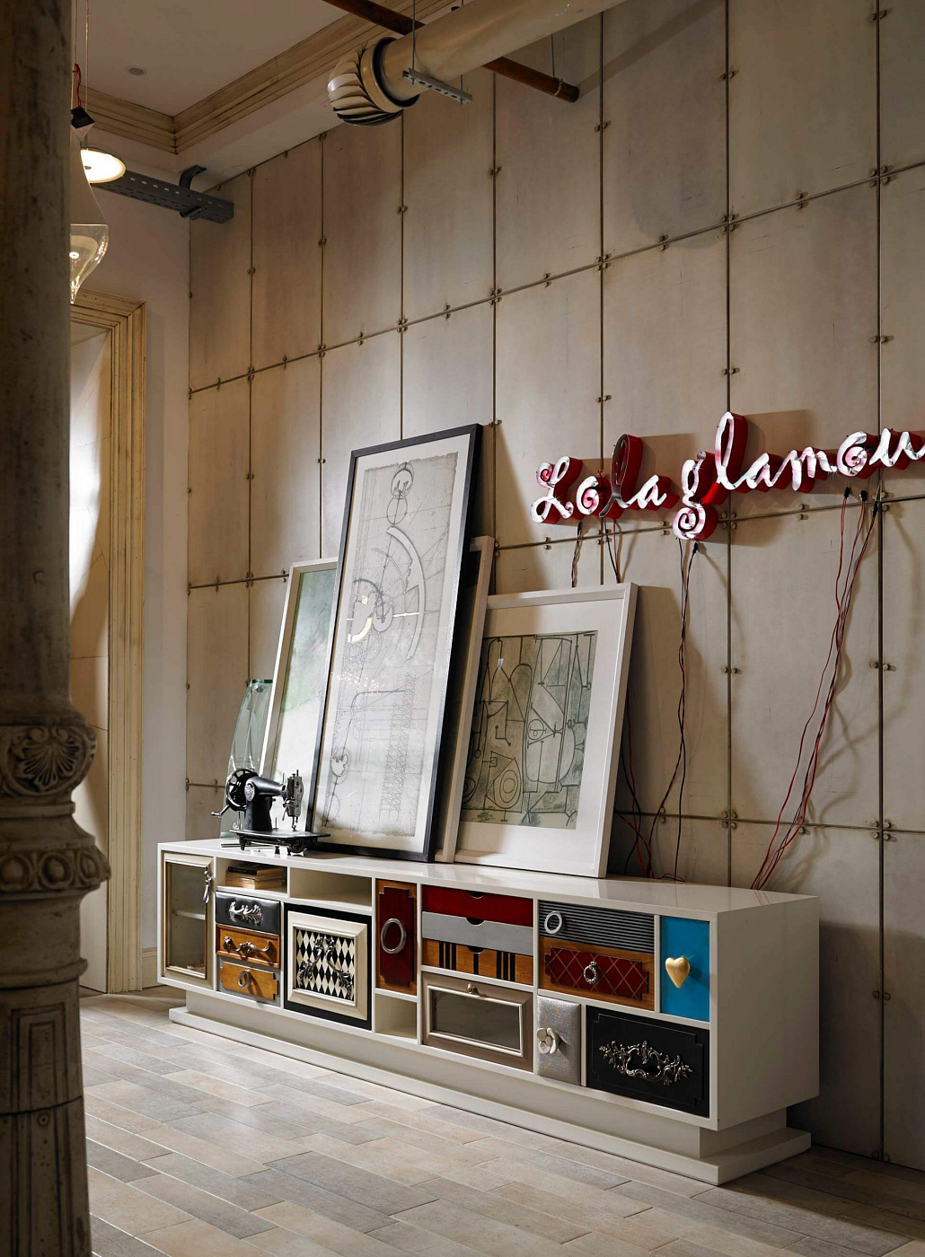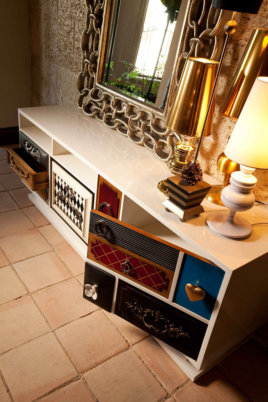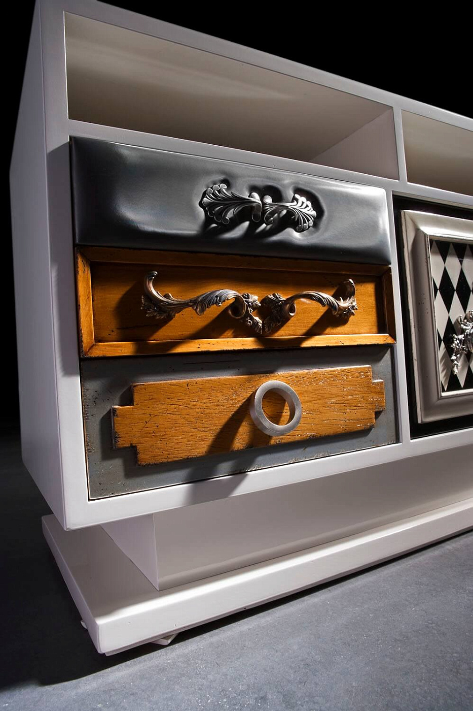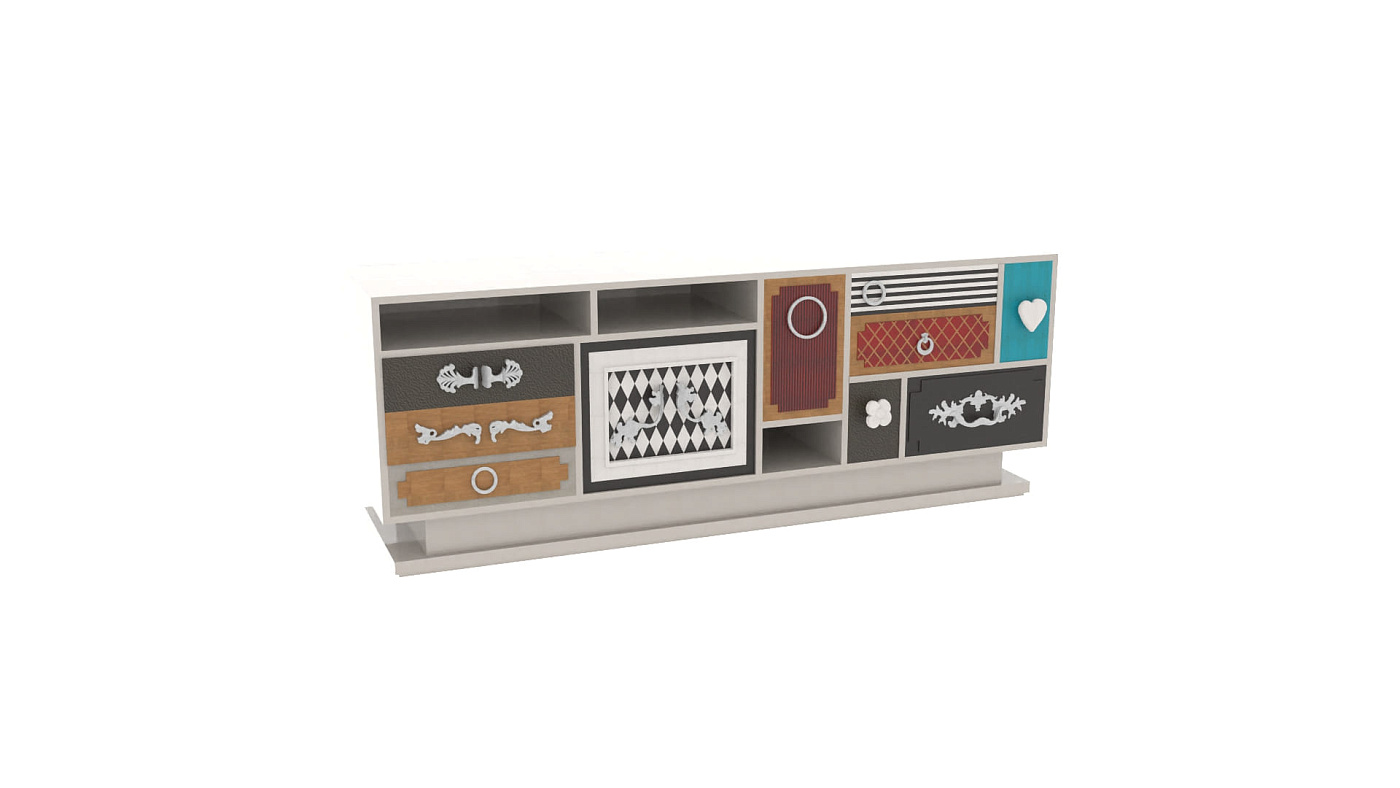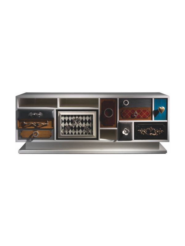 Комод Punk от испанской фабрики Lola Glamour изготавливается вручную из массива португальской вишни. В основе его дизайна лежит причудливое сочетания различных текстур, узоров, цветов и материалов отделки. Каждый ящик этого комода имеет свою дверцу и уникальную ручку на ней. Судя по всему, дизайн отдельных элементов комода Punk был навеян творчеством Сальвадора Дали. По желанию фурнитура, цвет и размер комода Punk (включая количество ящиков) могут быть изменены.