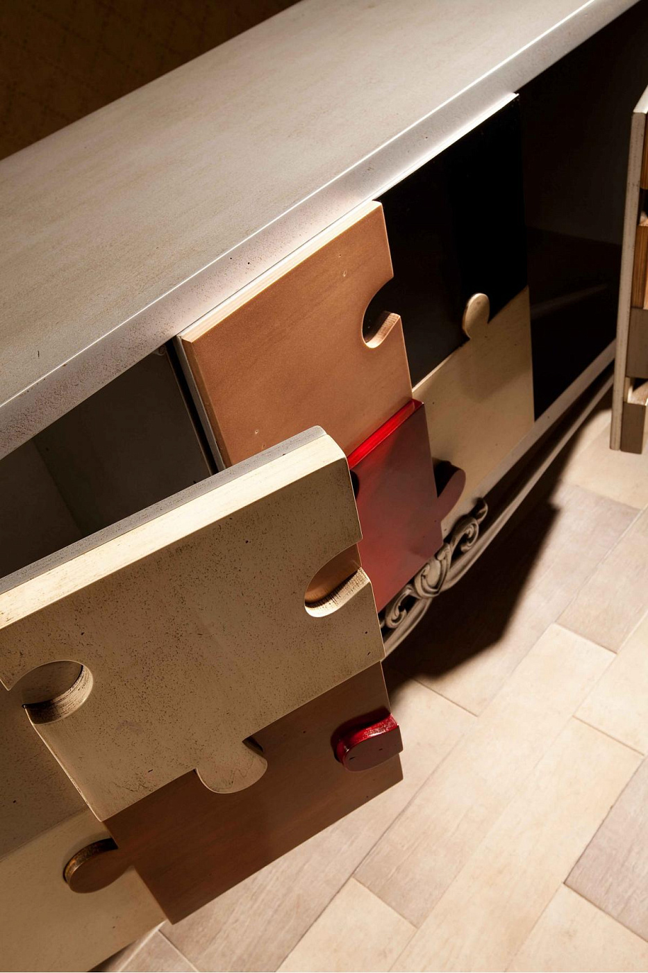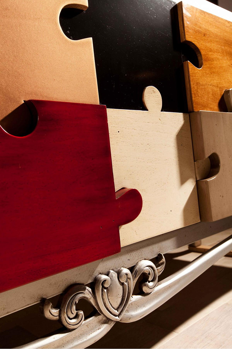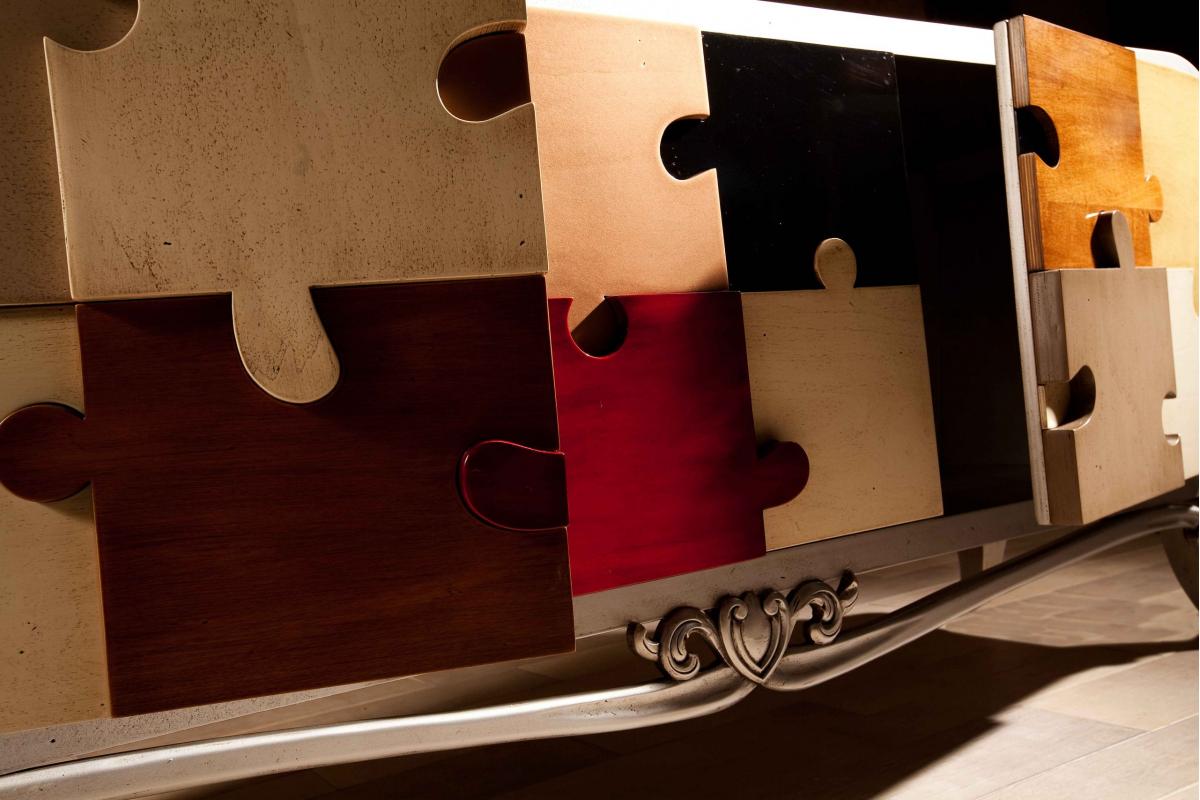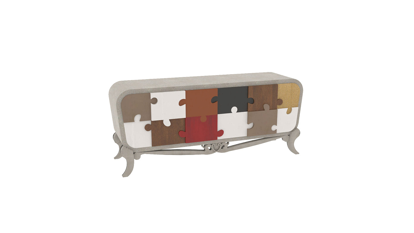 Сервант Puzzle от испанского производителя дизайнерской мебели фабрики Lola Glamour изготовлен вручную из массива португальской вишни. Фасад комода декорирован разноцветными деревянными элементами, выполненными в виде фрагментов паззла – классической головоломки, целью которой является создание единой картинки из отдельных частей. Ножки комода выполнены в неоклассическом стиле. Этот яркий дизайнерский комод представляет собой нечто большее, чем просто предмет мебели для гостиной – это настоящий арт-объект. С одинаковым успехом его можно разместить в любой комнате, в том числе и в детской.