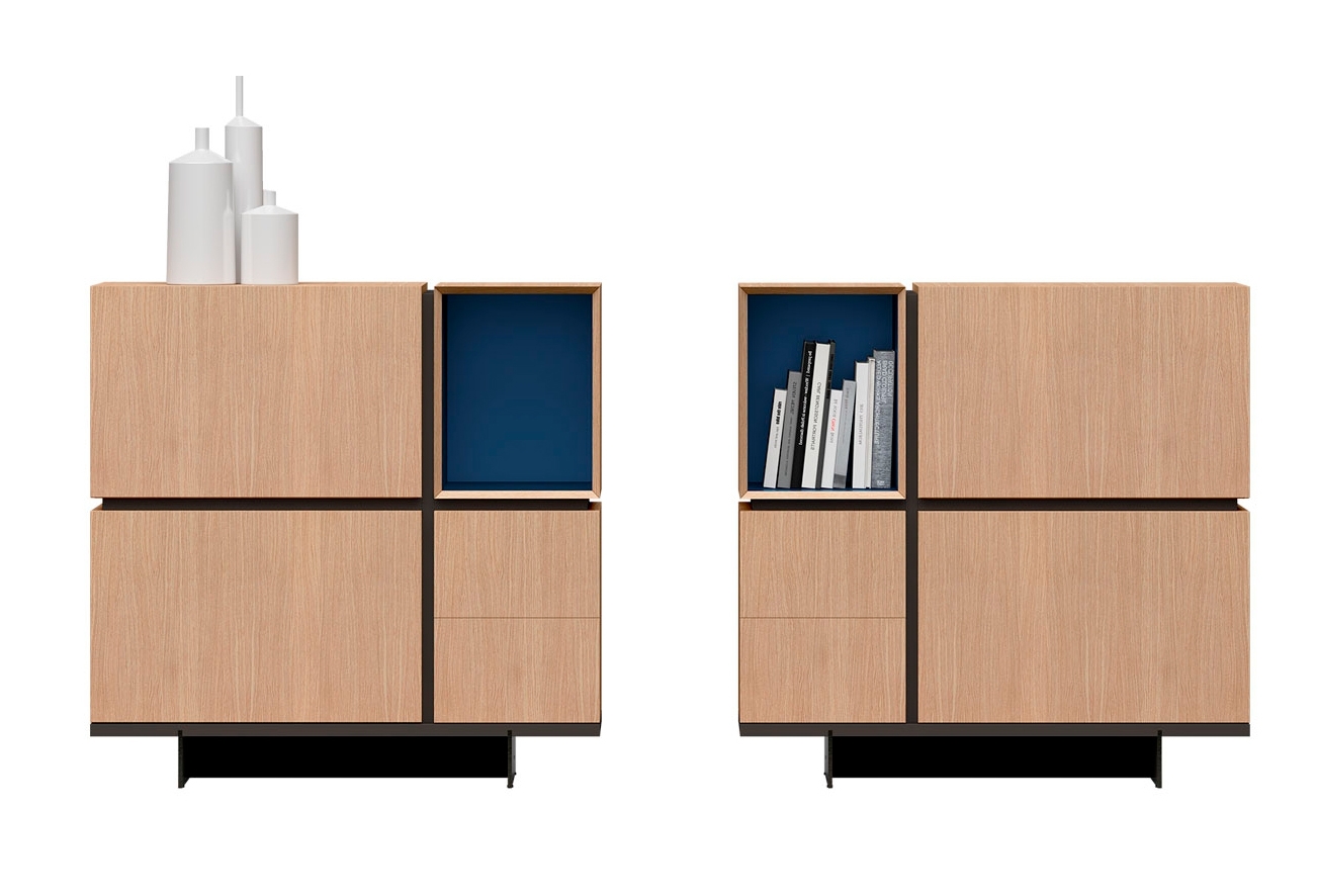 Комбинация двух квадратных полностью симметричных сервантов. Сочетание дверей, выдвижных ящиков и деревянных разделителей придает комбинации идеально симметричный вид. Это идеально выполненная и абсолютно гармоничная комбинация для хранения. Металлические ножки приподнимают и придают открытости комбинации.