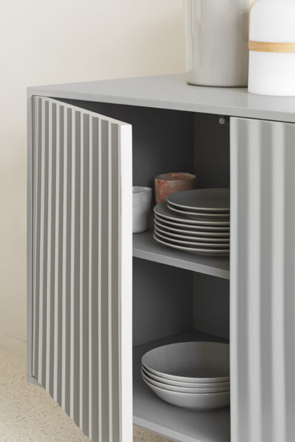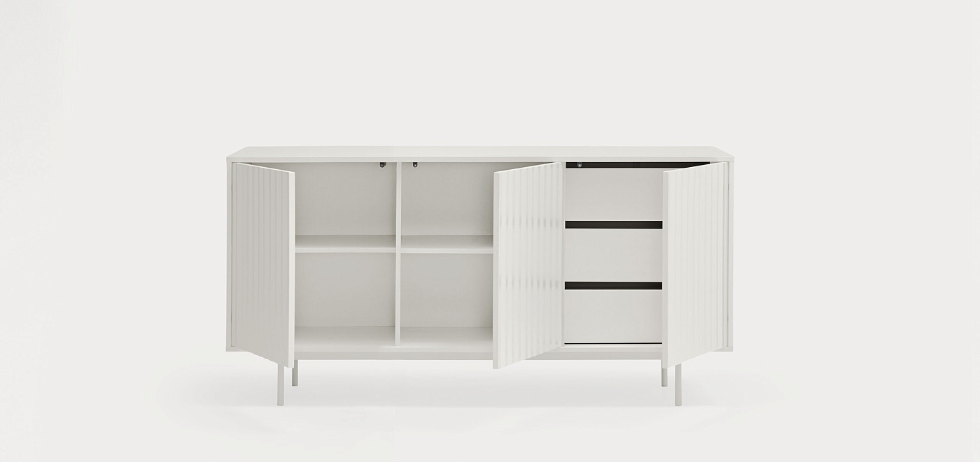 Самая большая особенность серванта Sierra - это особенность его текстур и форм, которые по-разному взаимодействуют в зависимости от окружающей среды. На передней части этого предмета мебели нанесен особый рельефный рельеф из коллекции. Он выполнен в лакированном корпусе МДФ разных цветов и включает в себя открывание и закрывание дверей нажатием. Он оснащен регулируемой опорной ножкой, которая идеально подходит для любых неровностей пола.