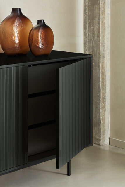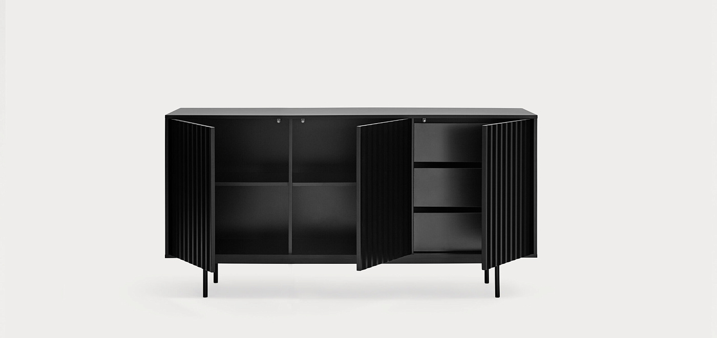 Самая большая особенность серванта Sierra - это особенность его текстур и форм, которые по-разному взаимодействуют в зависимости от окружающей среды. На передней части этого предмета мебели нанесен особый рельефный рельеф из коллекции. Он выполнен в лакированном корпусе МДФ разных цветов и включает в себя открывание и закрывание дверей нажатием. Он оснащен регулируемой опорной ножкой, которая идеально подходит для любых неровностей пола.