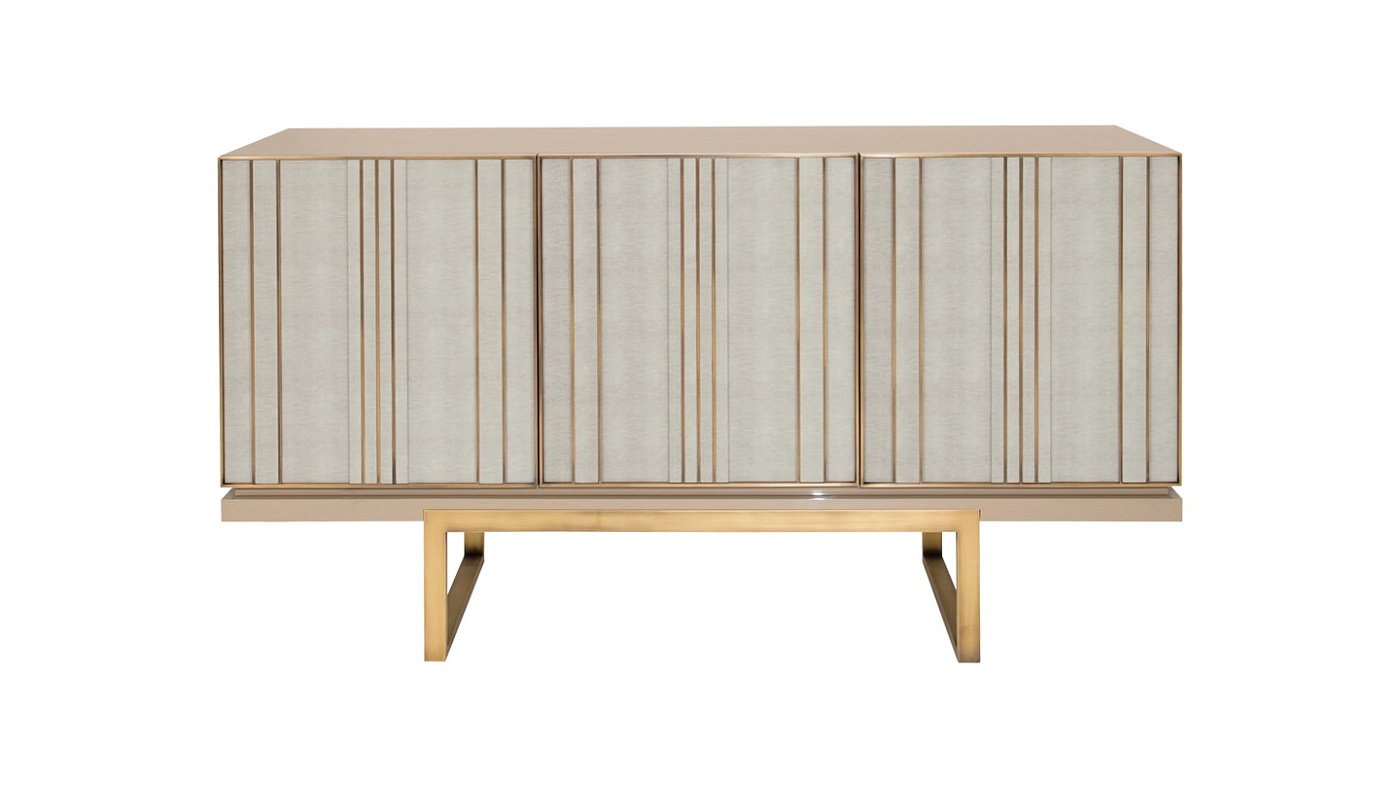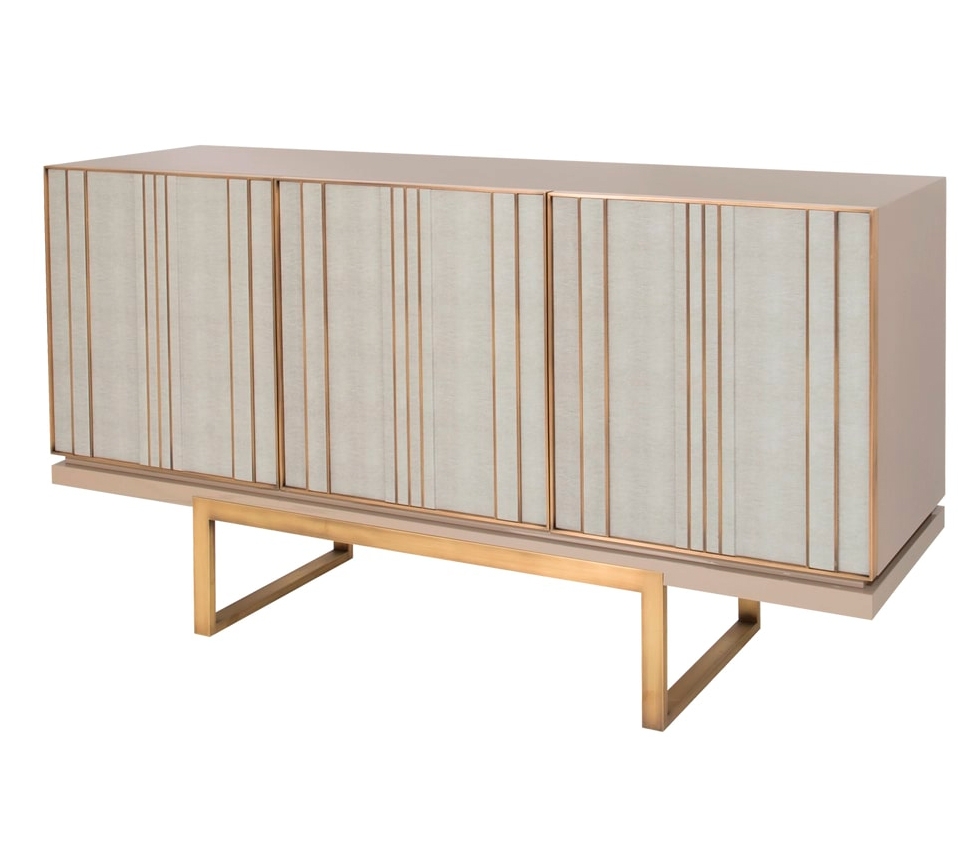 Привлекательный сервант ASCOT, являющийся частью коллекции из трех предметов для хранения, оснащен ящиком из глянцевого лакированного дерева и металлическим основанием. Три двери, инкрустированные кожей и украшенные нерегулярными латунными полосками, придают дизайну неожиданный ритм.