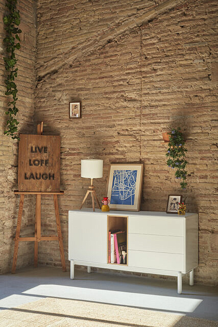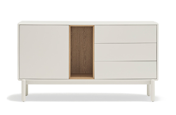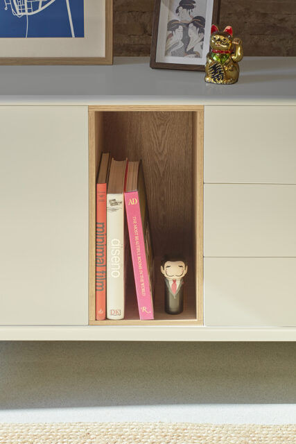 Закругленные края по всему периметру мебели придают коллекции Corvo мягкий и объемный вид. В свою очередь, это то, что позволяет точно интегрировать все детали без необходимости в дополнительных деталях, создавая гораздо более чистый и ухоженный вид. Сервант выполнен из МДФ за исключением облицованной дубом нише.