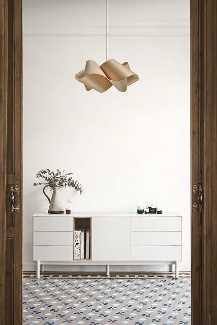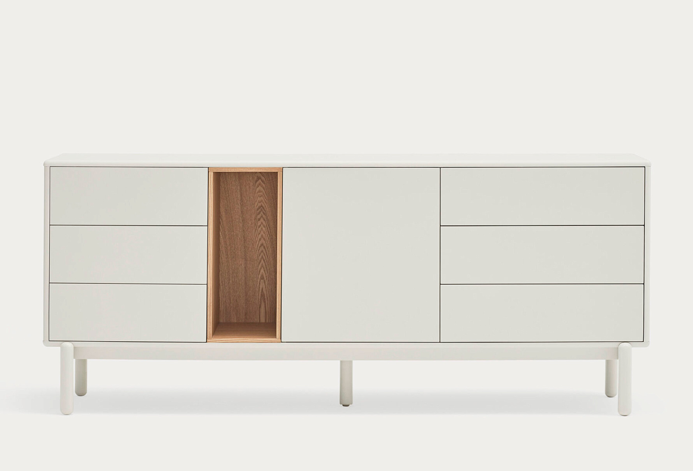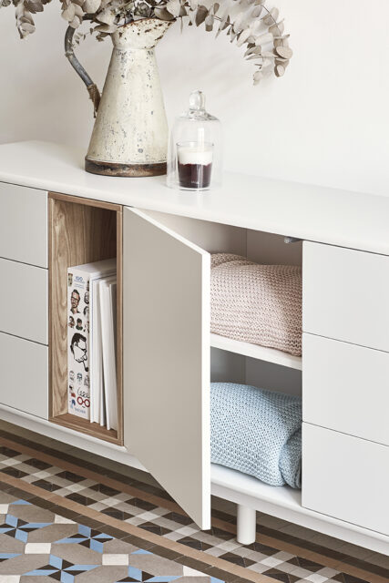 Закругленные края по всему периметру мебели придают коллекции Corvo мягкий и объемный вид. Сервант выполнен из МДФ, за исключением облицованной нише дубом.