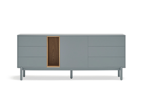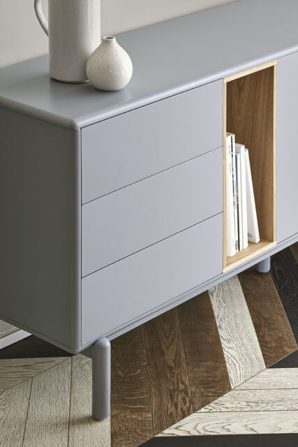 Закругленные края по всему периметру мебели придают коллекции Corvo мягкий и объемный вид. Сервант выполнен из МДФ, за исключением облицованной дубом нише.