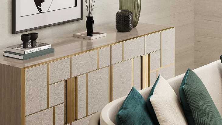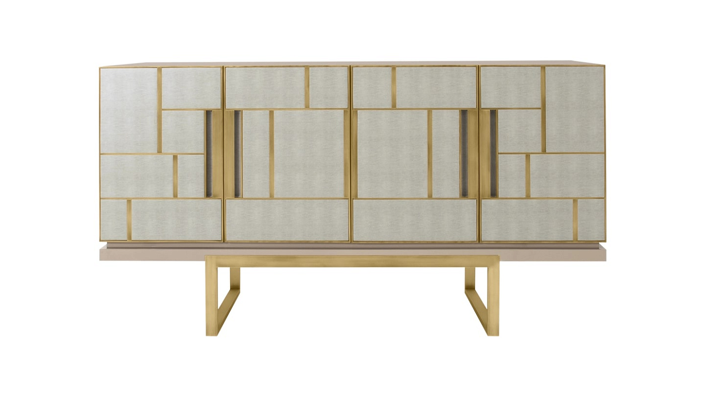 Две двойные дверцы серванта DIDOT, выполненные из матовой латуни и инкрустированные роскошными вставками из искусственной кожи животных, являются по-настоящему выдающимся изделием и шикарным способом придать вашему пространству геометрическую выразительность.