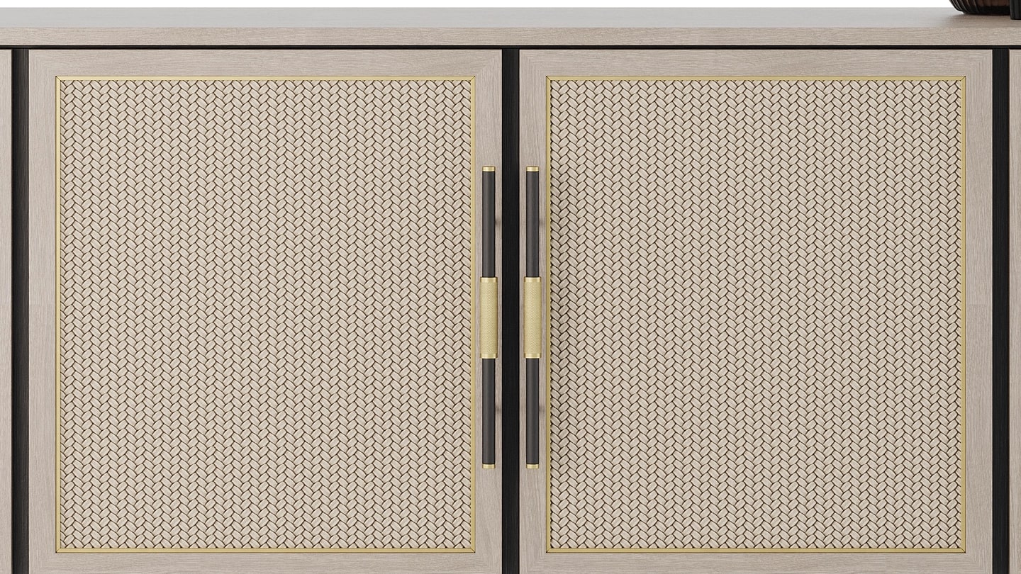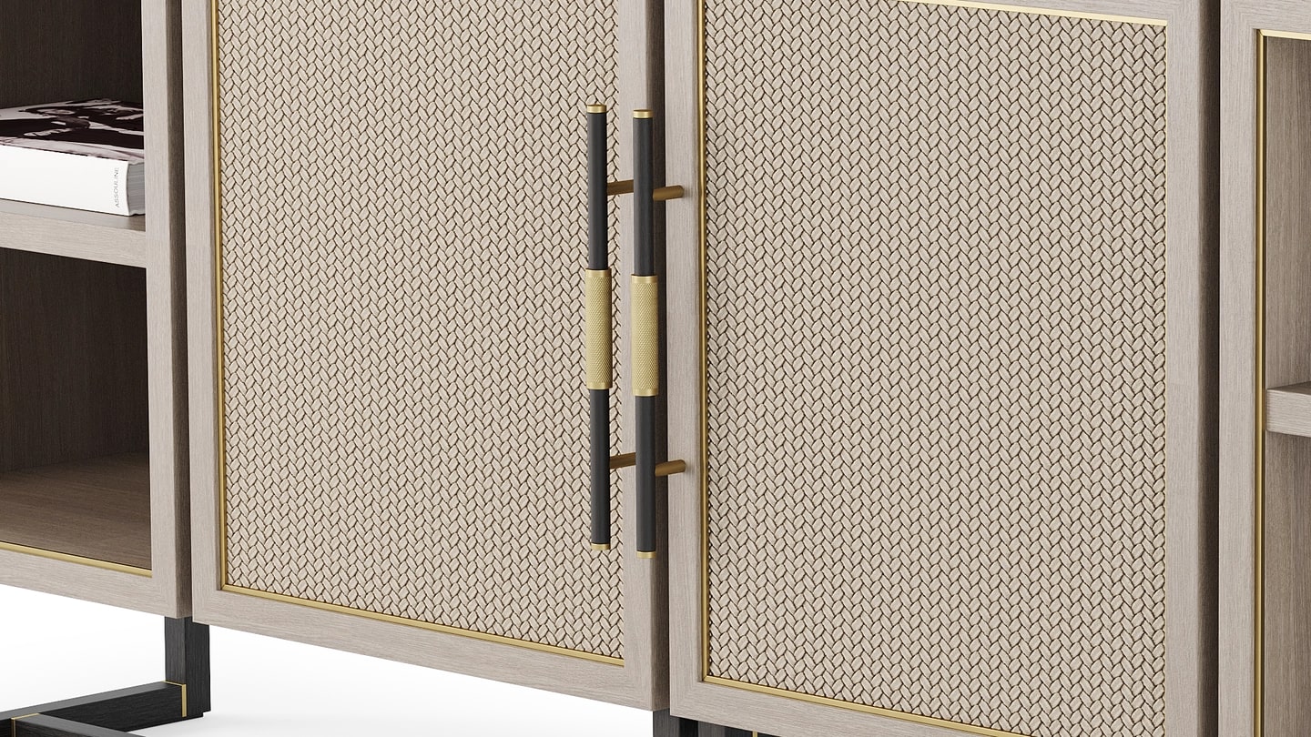 Сервант MYKONOS полон дизайнерских деталей, на которые приятно смотреть и к которым приятно прикасаться. К ним относятся гравированные латунные "манжеты" на элегантных ручках и искусственная кожа с искусственным переплетением на передней панели каждой двери.