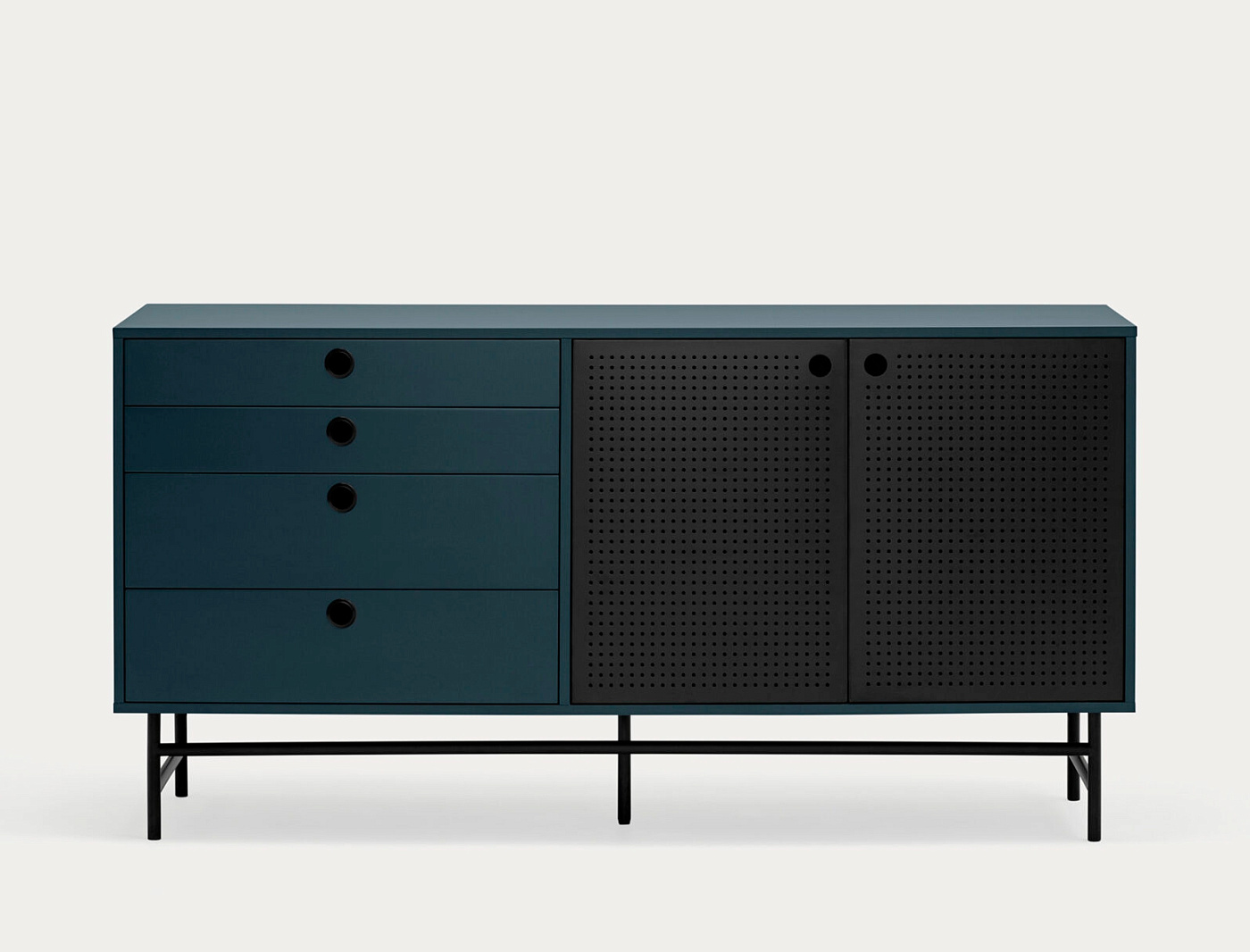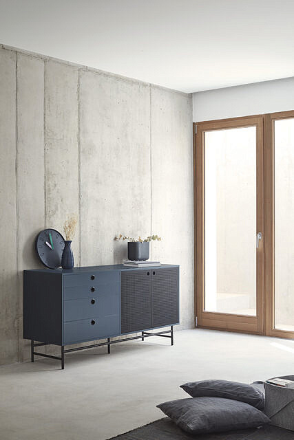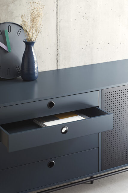 Сервант Punto, оформленный в индустриальном стиле, сочетает в себе эти эстетические концепции с дизайном и функциональностью. Коллекция отличается перфорированными металлическими дверцами со встроенными круглыми ручками. Корпус выполнен в лакированном МДФ различных цветов.