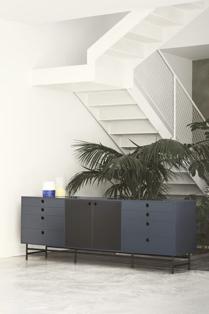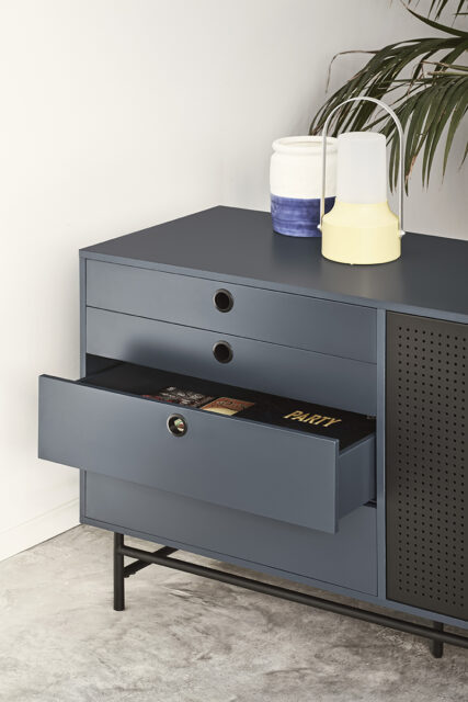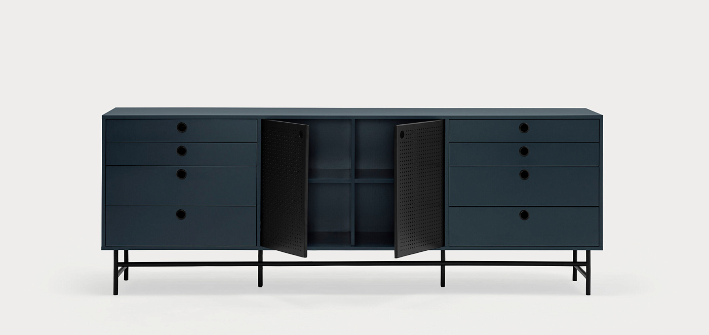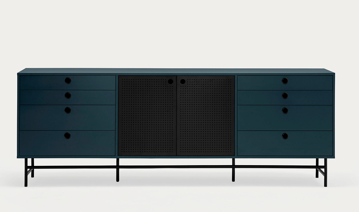 Комод Punto, оформленный в индустриальном стиле, сочетает в себе эти эстетические концепции с дизайном и функциональностью. Коллекция отличается перфорированными металлическими дверцами со встроенными круглыми ручками. Корпус выполнен в лакированном МДФ различных цветов.