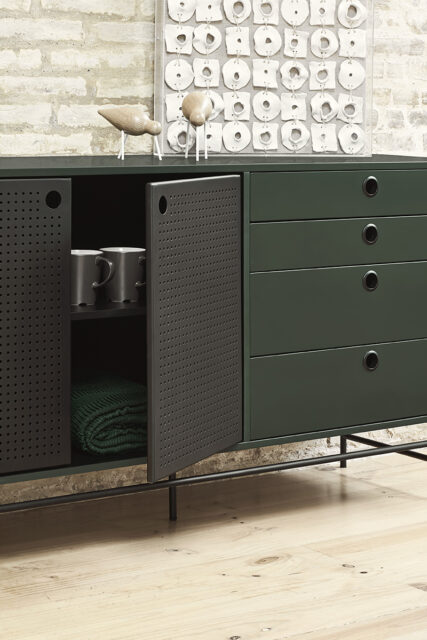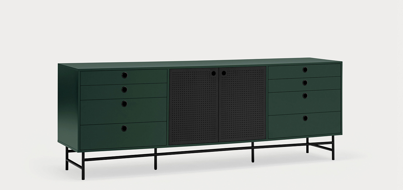 Комод Punto, оформленный в индустриальном стиле, сочетает в себе эти эстетические концепции с дизайном и функциональностью. Коллекция отличается перфорированными металлическими дверцами со встроенными круглыми ручками. Корпус выполнен в лакированном МДФ различных цветов.