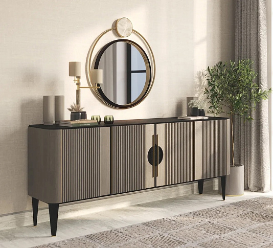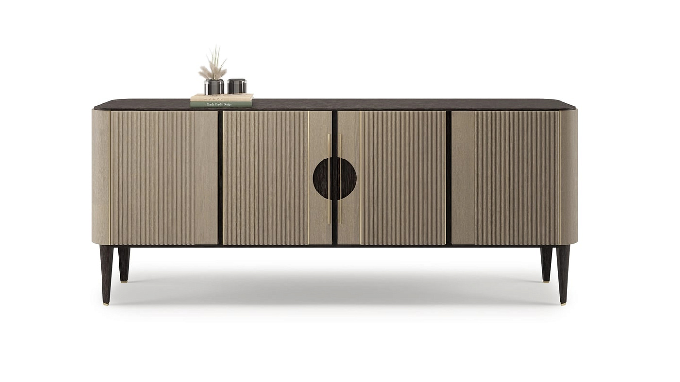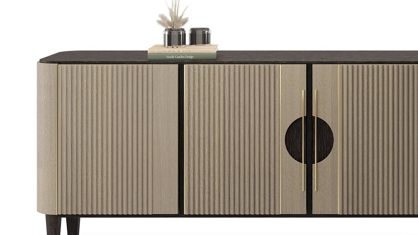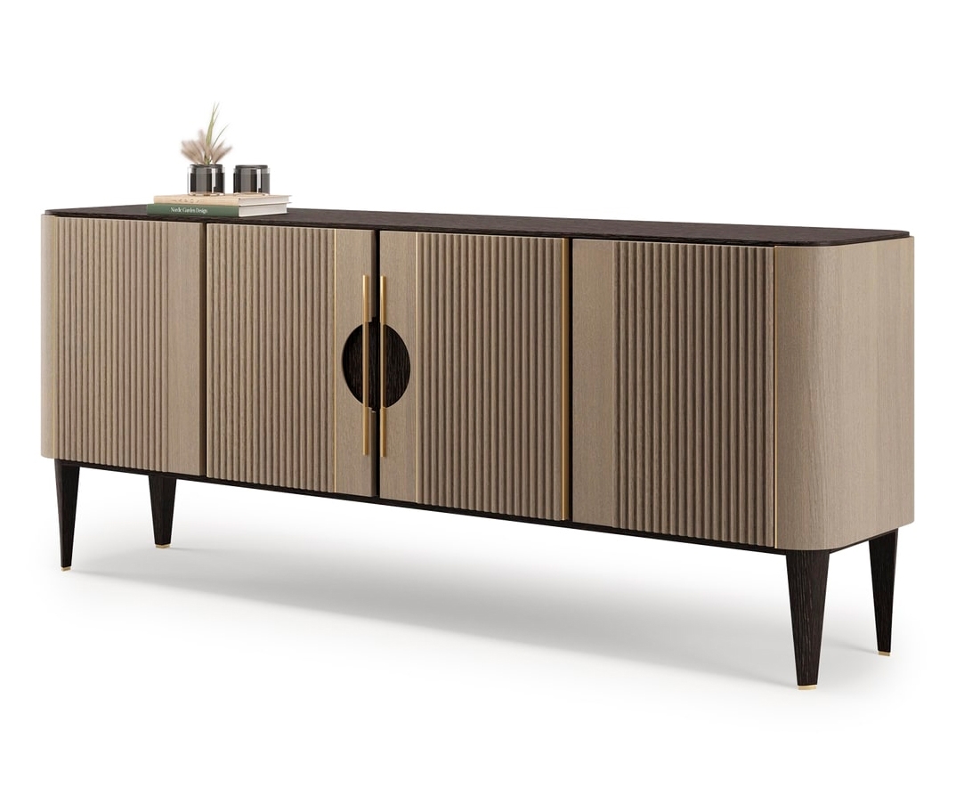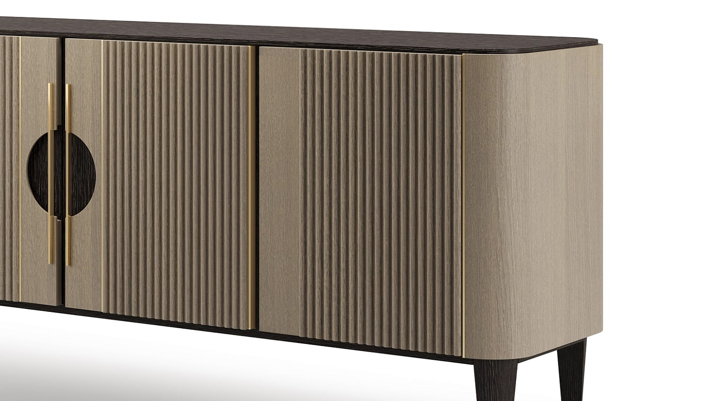 Благодаря четко очерченному профилю сервант suave TAIPEI придает своей форме текстуру и размерность благодаря рифленым дверным фасадам и контрастным оттенкам массива дерева и шпона. Изящные вставки из матовой латуни создают завершающий штрих.