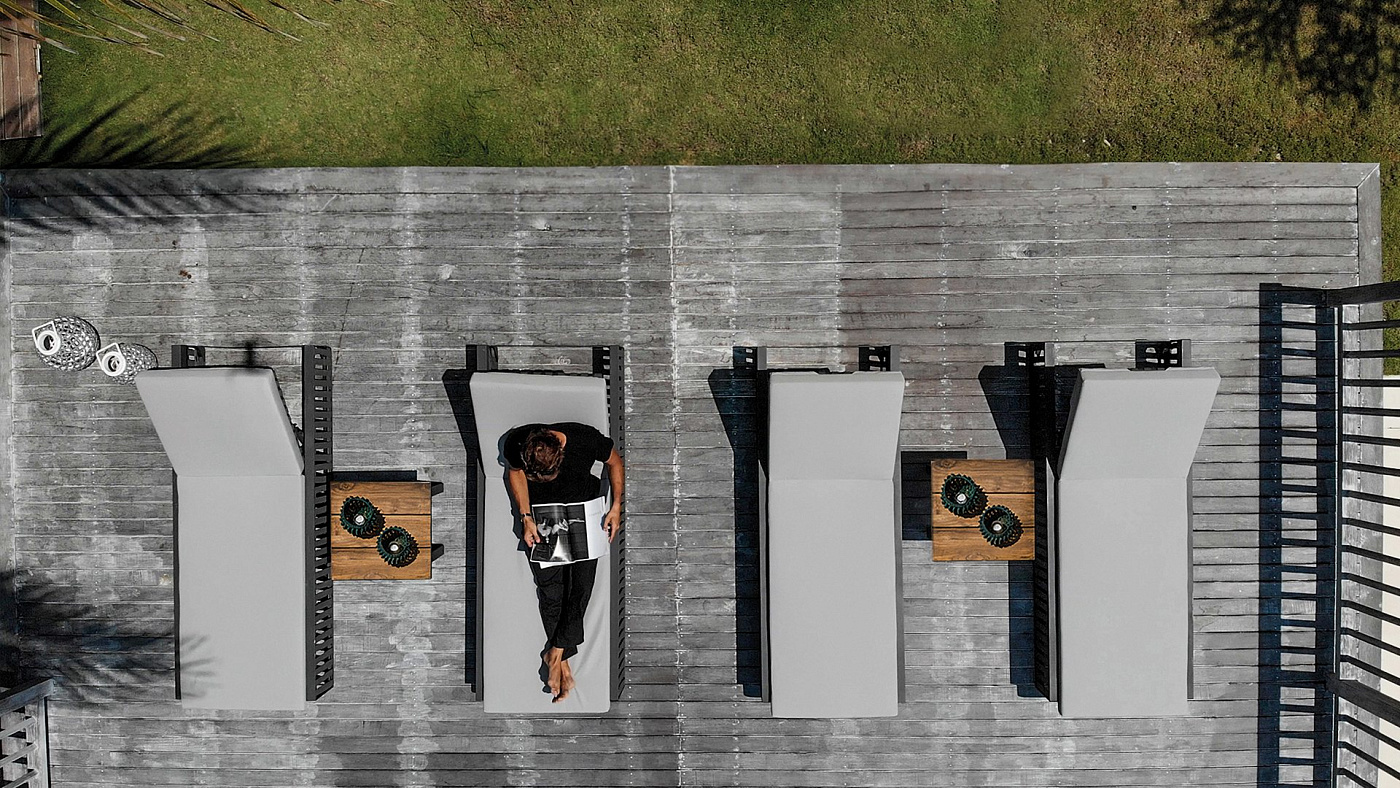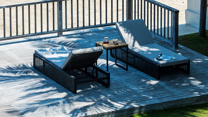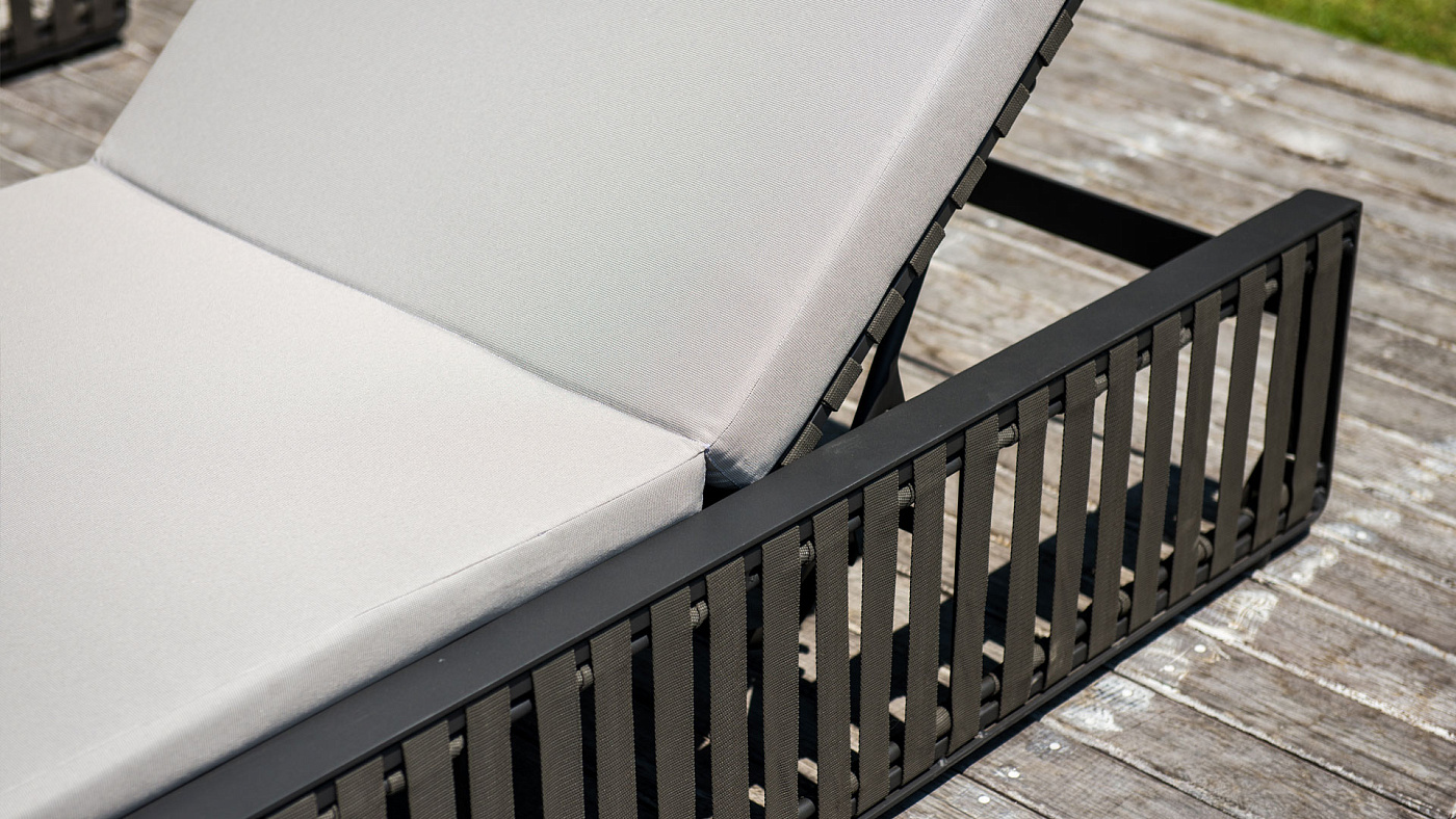 Одна из последних разработок в нашем новом каталоге. Сочетание черного алюминия, темно-серых ремешков и подлокотников из тикового дерева создает универсальную коллекцию, идеально подходящую как городским экстерьерам, так и пространствам для отдыха.