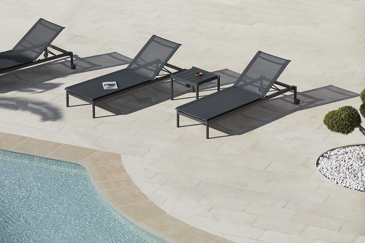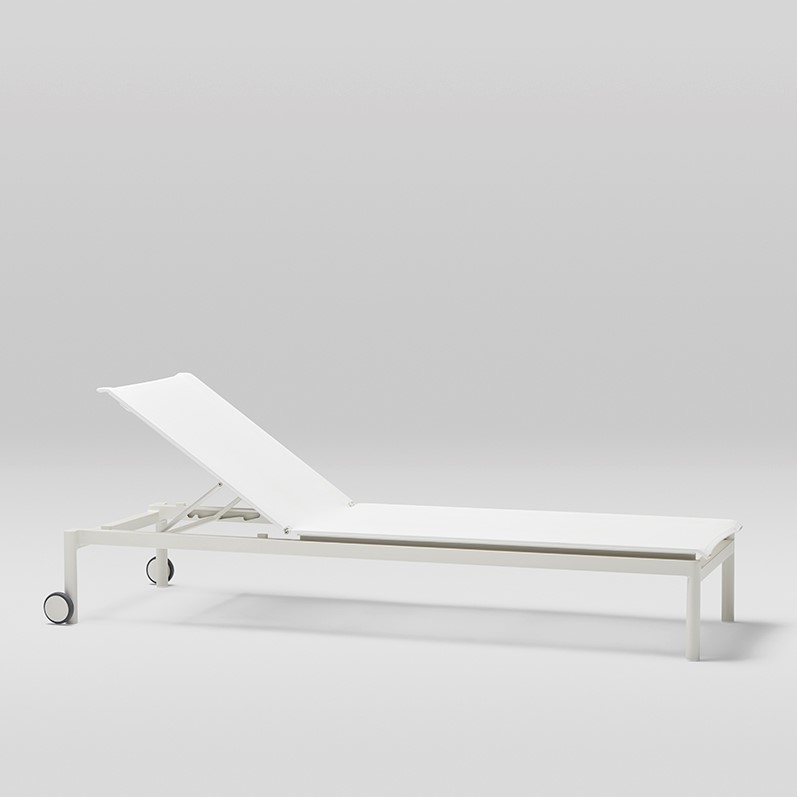 Штабелируемый лежак с колесами. Алюминиевая конструкция с порошковым покрытием доступна в кремовом цвете 34 и сером цвете 56. Сиденье и спинка из термосвариваемого батилина.