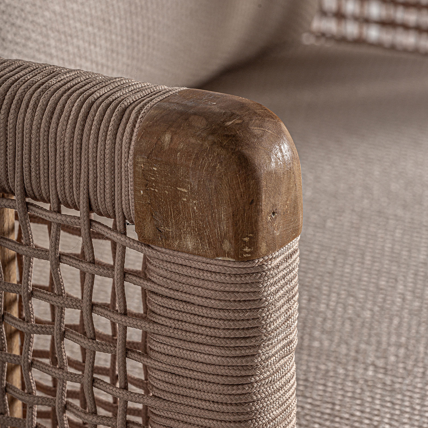 Элегантность коллекции Trena — это сумма двух концепций: легкости и силы. Спинка представлена как обволакивающая деталь, охватывающая весь комплект, создавая интимное пространство, где основным материалом является веревка. На диване ротанг покоится на платформе из переработанного тикового дерева: конструкция, которая поддерживает его, приподнимает и придает ощущение невесомости, нежности и утонченности.