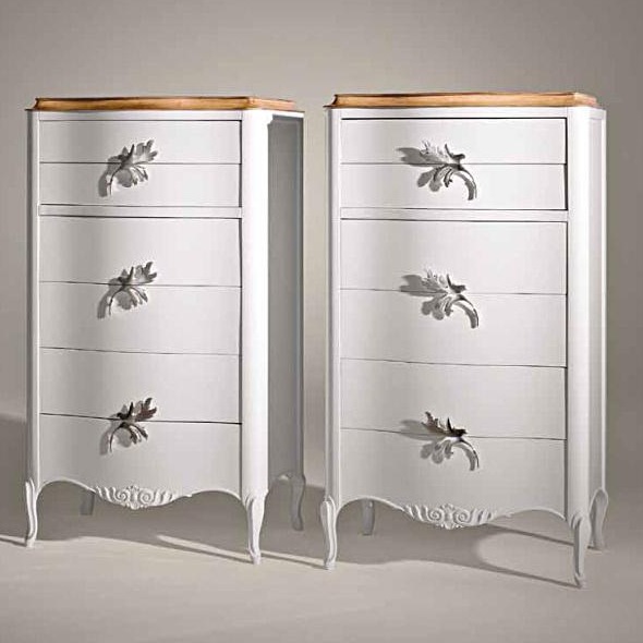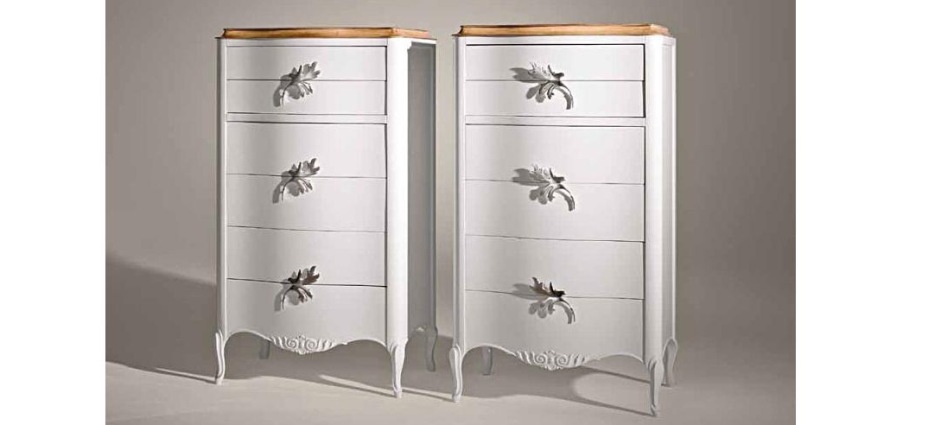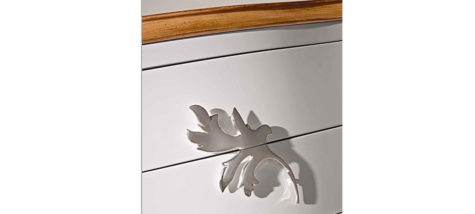 Шифоньер в спальню Gala выполнен вручную из элитной древесины. Дизайнеры AM Classic представили модель в белом цвете, однако оставили возможность сполна насладиться натуральной фактурой дерева: поверхность шифоньера демонстрирует всю игру волокон и уникальные древесные отметины, которые так ценятся знатоками. Обратите внимание на необычные металлические ручки в виде листьев — за каждым ящиком запреплена своя половинка листа. Изогнутые ножки — реверанс эпохе королевы Анны и знаменитого краснодеревщика Чиппендейла.