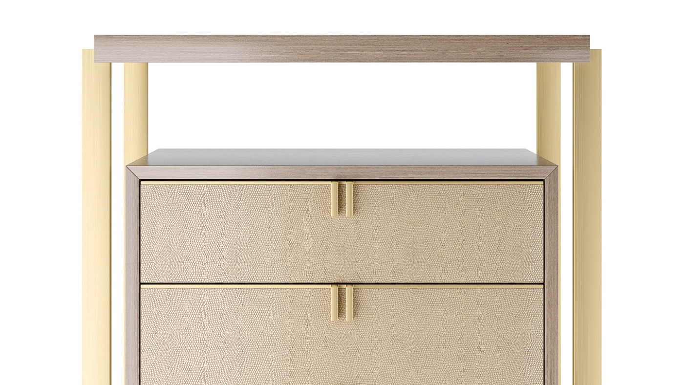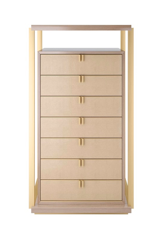 Воплощая идею дизайна в дизайне, LEXTON tallboy представляет собой коробку из глянцевого деревянного шпона с семью выдвижными ящиками с латунными ручками, кожаными фасадами и замшевыми внутренностями. При этом взаимосвязанная структура из шпона и металла создает дополнительное пространство на поверхности и мгновенный эффект "вау".