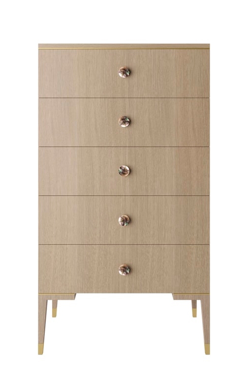 Четкие линии тумбы MOONSTONE, облицованной деревянным шпоном, подчеркнуты деталями из матовой латуни, которые подчеркивают ее утонченный силуэт в стиле ар-деко, а круглые ручки, отделанные черным перламутром, придают завершающий штрих.