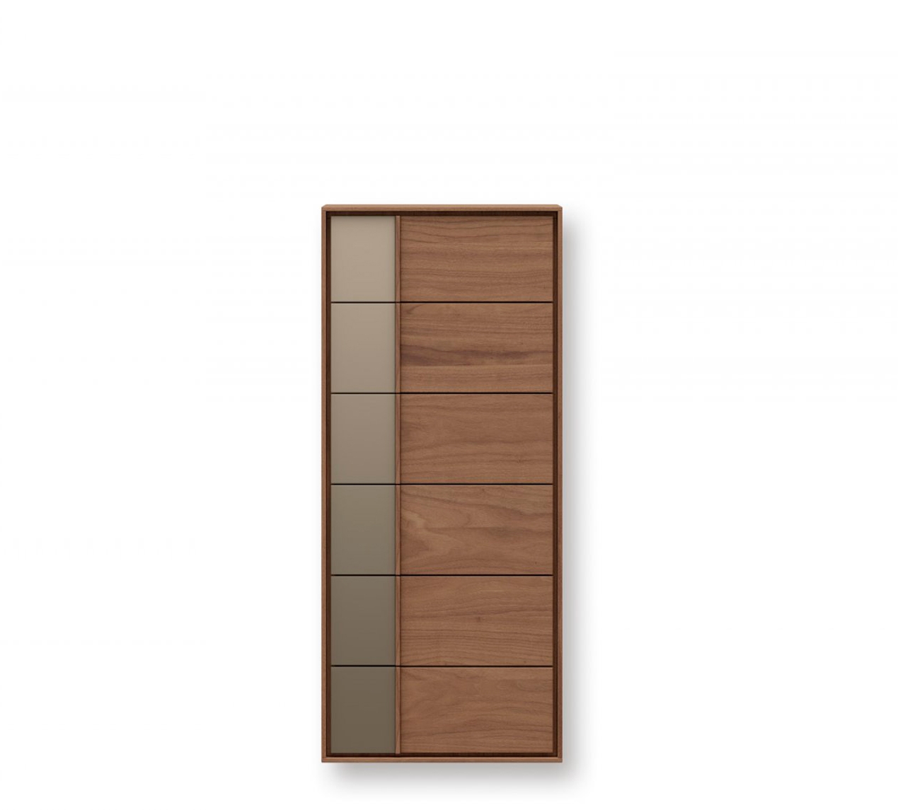 В основе нового шифоньера лежит сдержанный и элегантный дизайн, который позволяет использовать широкий спектр решений для хранения. Его главной эстетической особенностью является рамка по периметру, охватывающая внутреннюю коробку, а также вертикальная ручка, нарушающая симметрию дизайна. Дизайн основан на сочетании отделки коробки по периметру и фасадов. Кроме того, на фасадах добавлена вставка из бронзового стекла. Оснащена направляющими скольжения BLUM с двухтактным открыванием.