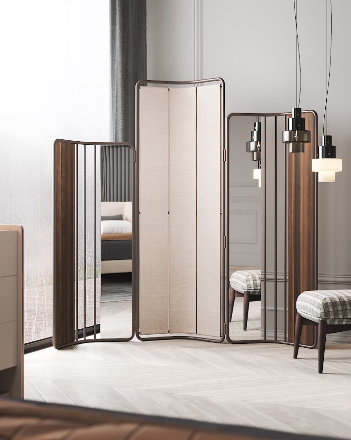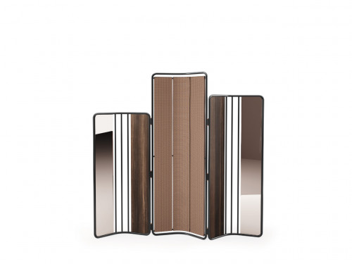 Бамбук, как известно, является одним из самых прочных и элегантных деревьев в природе. Поэтому сочетание металлической трубчатой конструкции, которая охватывает деревянные, зеркальные и тканевые панели, вдохновило нас на создание складной ширмы из бамбука, придающей любому разделению спальни стильный штрих и характер.