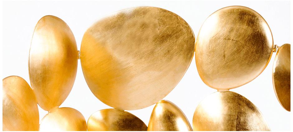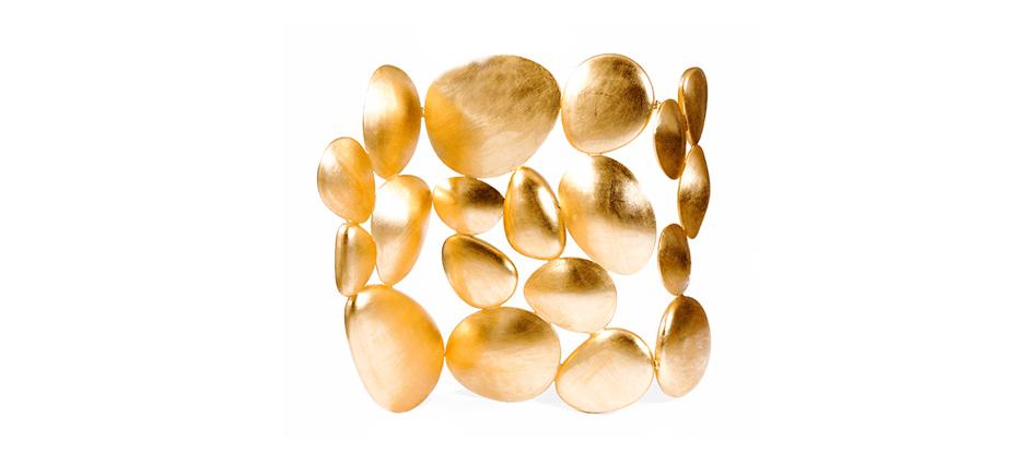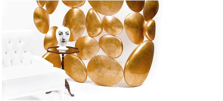 Gold – это настоящее произведение искусства, созданное мастерами компании Boca do Lobo в присущей только им манере. Своим внешним видом эта ширма напоминает россыпь камней на дне реки, обточенных ее быстрым течением. Каждый из 19 элементов этой конструкции сделан из стекловолокна, наполнен полиуретаном и покрыт листами сусального золота.