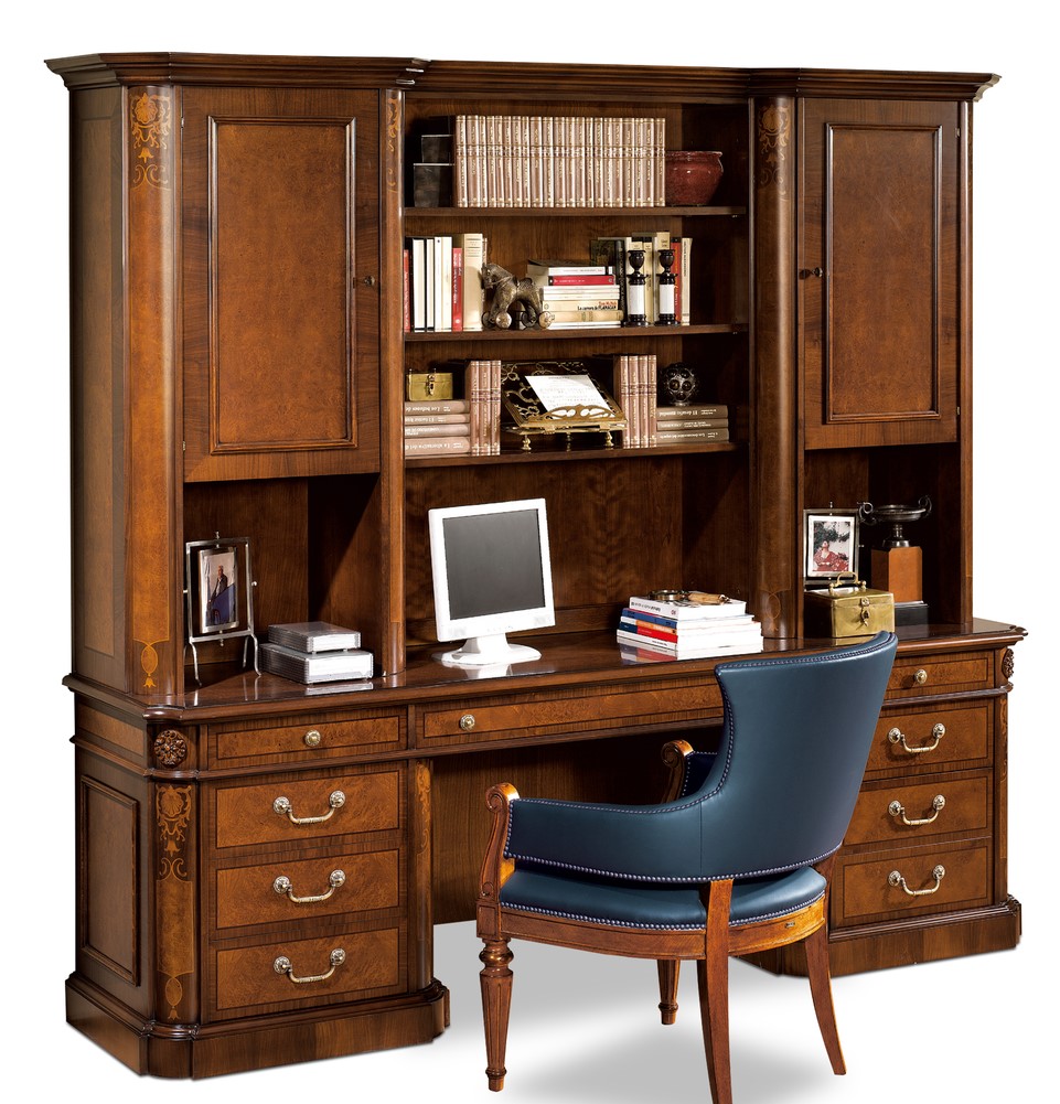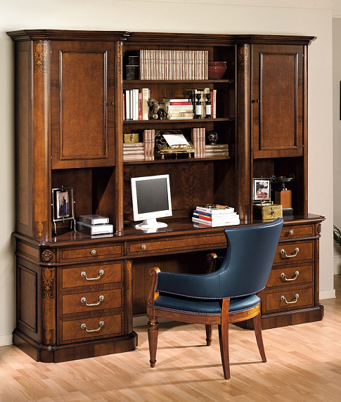 Коллекция Zafiro отличается массивностью, а в дизайне Executive сочетаются изысканная инкрустация и плавные изгибы с инкрустацией из капа испанского дуба. Шпон из ореха и капа дуба, лады из фиолетового палисандра, латунная фурнитура. Верхняя часть: 2 боковые дверцы с 2 регулируемыми деревянными полками внутри. Центральная секция с 2 деревянными полками. Нижняя часть: 3 выдвижных ящика под столешницей. Правая тумба с одним выдвижным ящиком и одним ящиком для документов, с замком для обоих ящиков. Левая тумба с дверцей, имитирующей 3 выдвижных ящика, с 1 регулируемой полкой внутри.