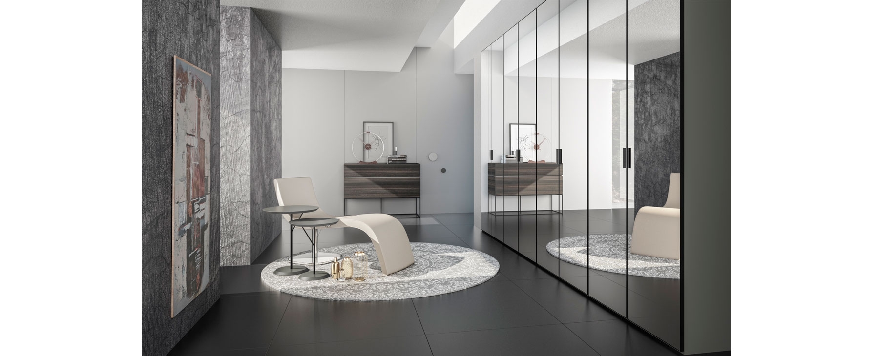 Элегантность, утонченность и отражения соединяются вместе, образуя дверь чистых линий с детализированной дверной ручкой, которая хорошо вписывается в дверь. Надежное и элегантное решение для дизайнерских спален. Отделка модели на изображении: Зеркальное стекло Алюминий, покрытый лаком Obsidiana На последних двух изображениях показаны различные интерьеры гардероба
