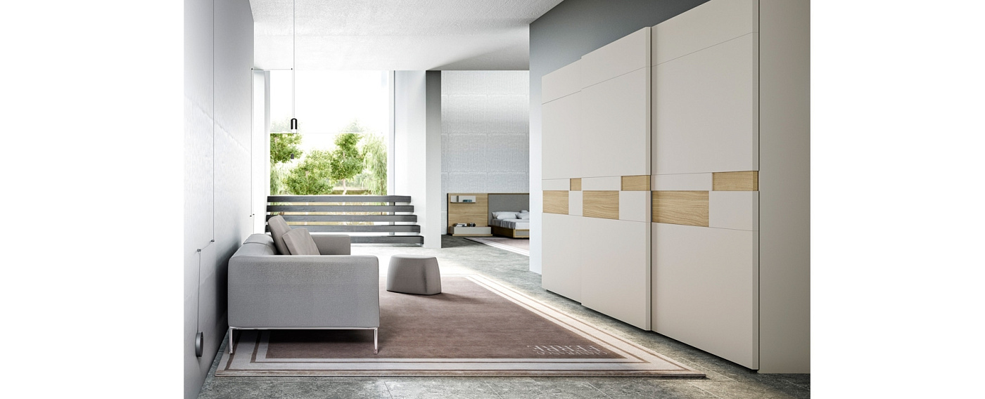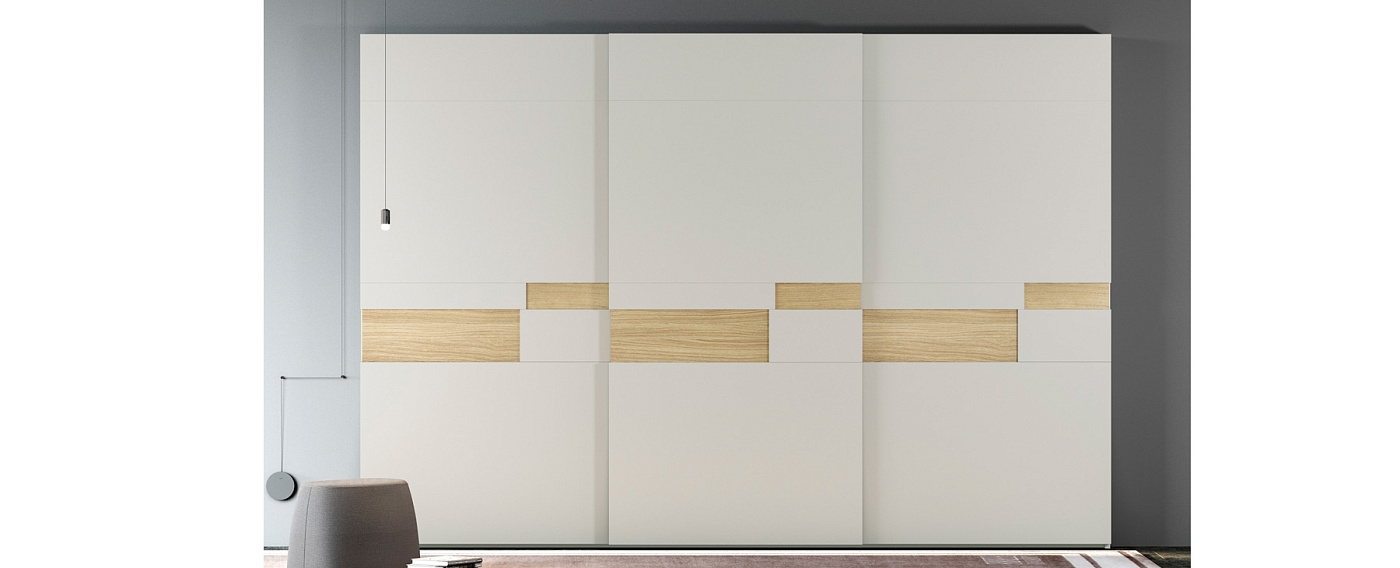 Раздвижные двери шкафа-купе ELIS могут быть разделены и расширены в зависимости от конструктивной сложности коллекции. Это настоящее испытание труда и разработок, которые действительно способны предложить идеальную дверь. Отделка модели на изображении: Лак Piedra Шпон дуба M На последних двух изображениях показаны различные интерьеры гардероба.