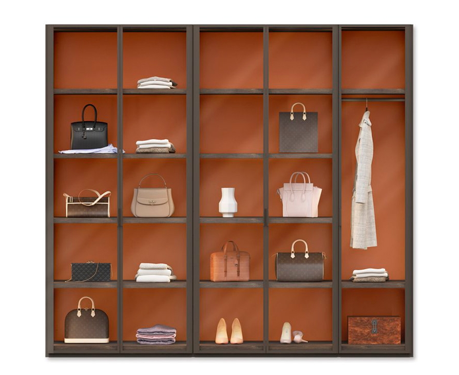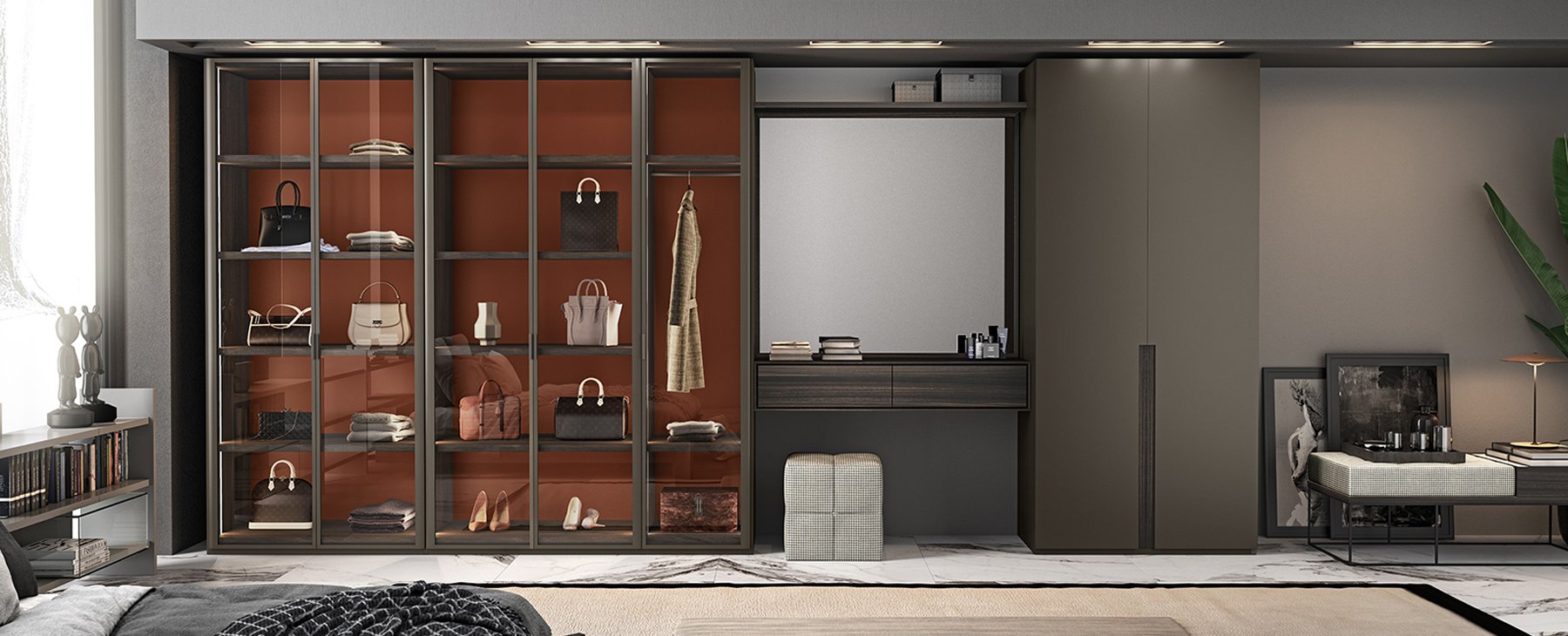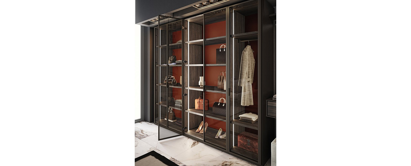 Двери шкафа GRIP позволяет увидеть внутреннюю часть шкафа. Благодаря использованию перфильерии из алюминия и прозрачных стекол, покажите нам самую важную часть шкафов: его интерьер. Отделка композиции: Перфильерия Лак Какао Стекло Дымчатый коричневый Стеклянные рисунки внутренний меламиновый табак Задняя часть Лакадская глина