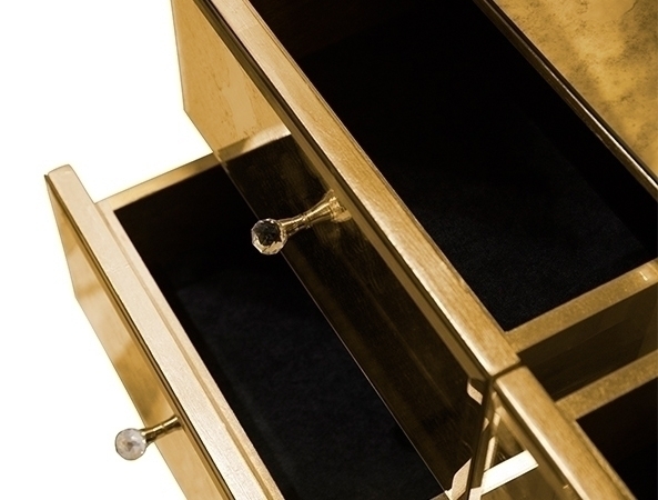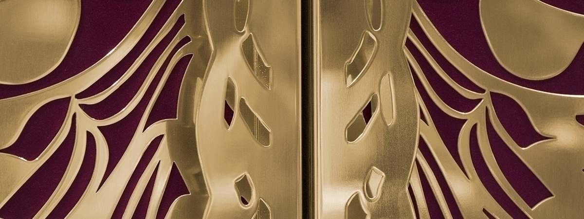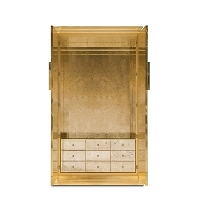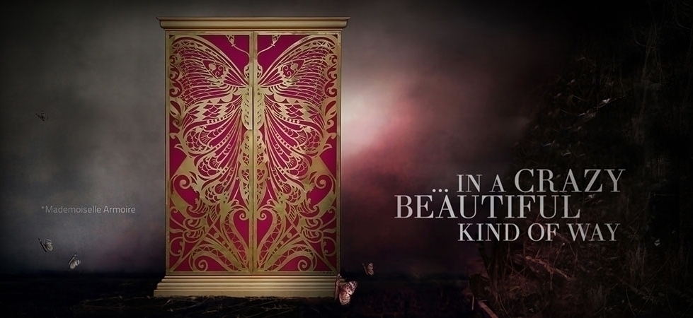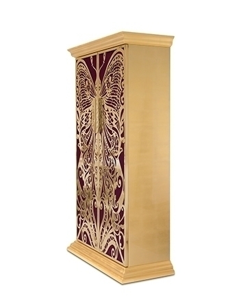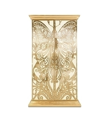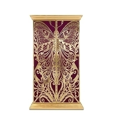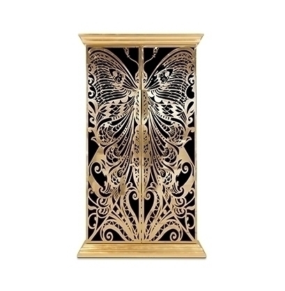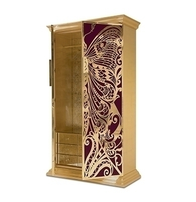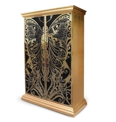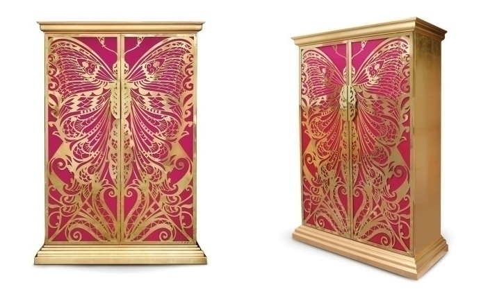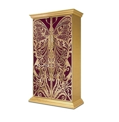 Высота шкафа составляет 210 см. Дверцы - это крылья бабочки, которые сделаны из полированной латуни, а также покрыты глянцевым лаком и сусальным золотом. Дверцы отделаны шелком цвета фуксии. "Цвет фуксии - наилучший цвет для любви и провокации в декоре, а также для воссоздания женской индивидуальности" - уверяют создатели. Внутри шкафа Вы найдете 9 выдвижных ящиков и 2 полки, сделанные из закаленного стекла.