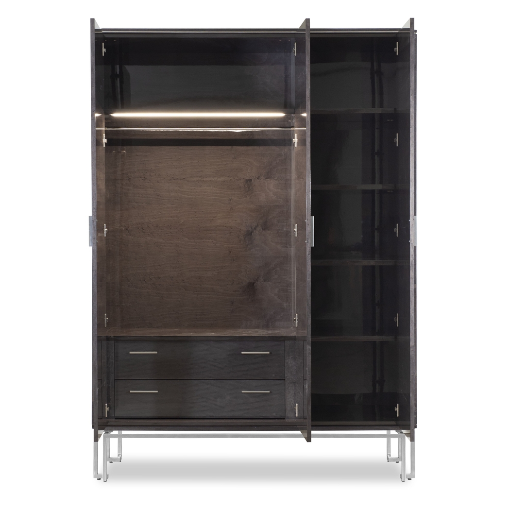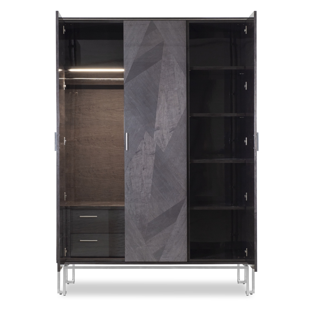 Элегантный и изящный шкаф Bond создан для того, чтобы стать изюминкой вашей спальни. Благодаря геометрическим формам и нестандартным планкам шкаф Bond выглядит роскошно и может преобразить любое пространство. 2 выдвижных ящика, 1 полка, 1 штанга для вешалок и подсветка внутри двухдверной секции. 4 полки внутри однодверной секции. Двери и ящики с механизмом плавного закрывания. Основание и ручки из нержавеющей стали.