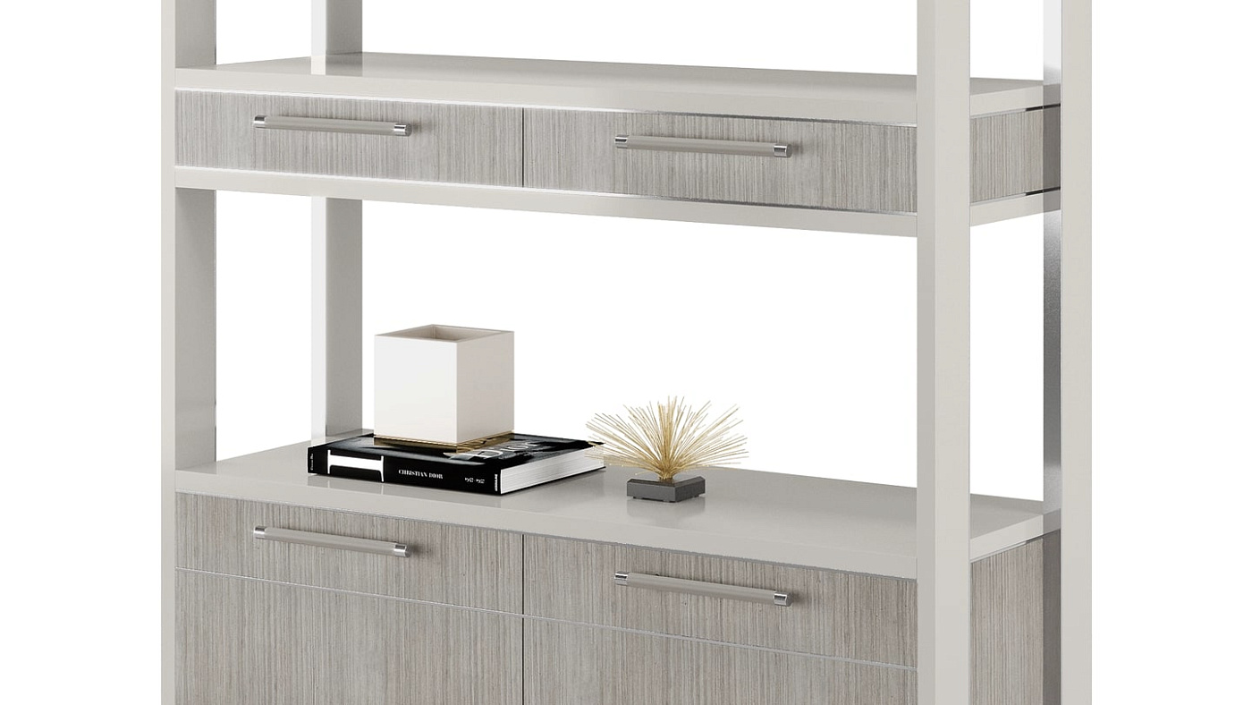 Глянцевый лакированный каркас и полки современного книжного шкафа BOLZANO тонко контрастируют с выдвижными ящиками и шкафчиками из деревянного шпона. Аккуратные линейные ручки, изготовленные из полированной нержавеющей стали и кожи, дополняют чистые, непрерывные линии дизайна.