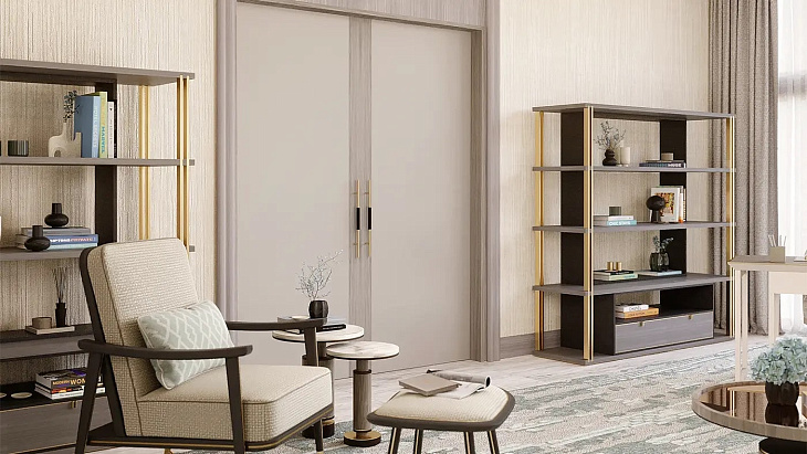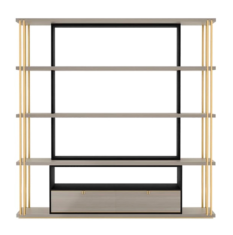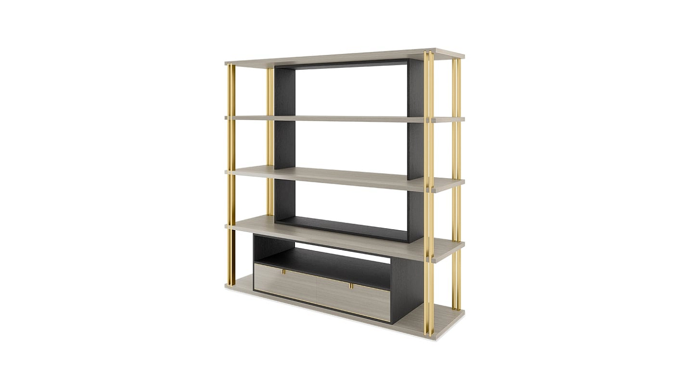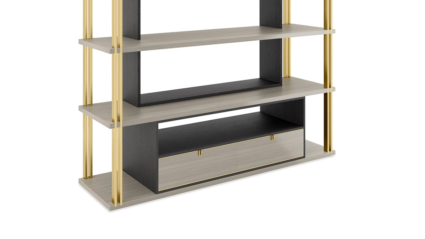 Стильный дизайн DHAKA, сочетающий открытые полки и выдвижные ящики низкого уровня, обыгрывает идею книжного шкафа внутри книжного шкафа, вставляя темный силуэт в центр внешней конструкции, выполненной из контрастного деревянного шпона и роскошной матовой латуни.