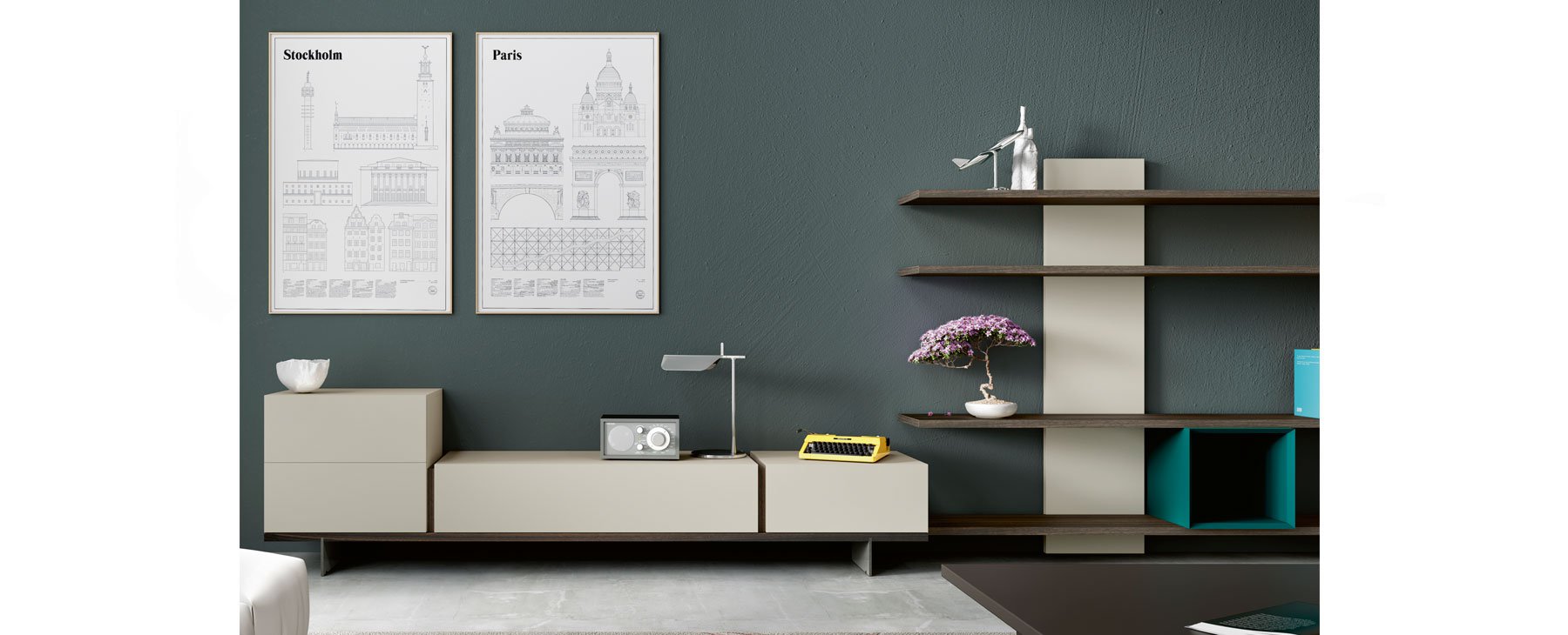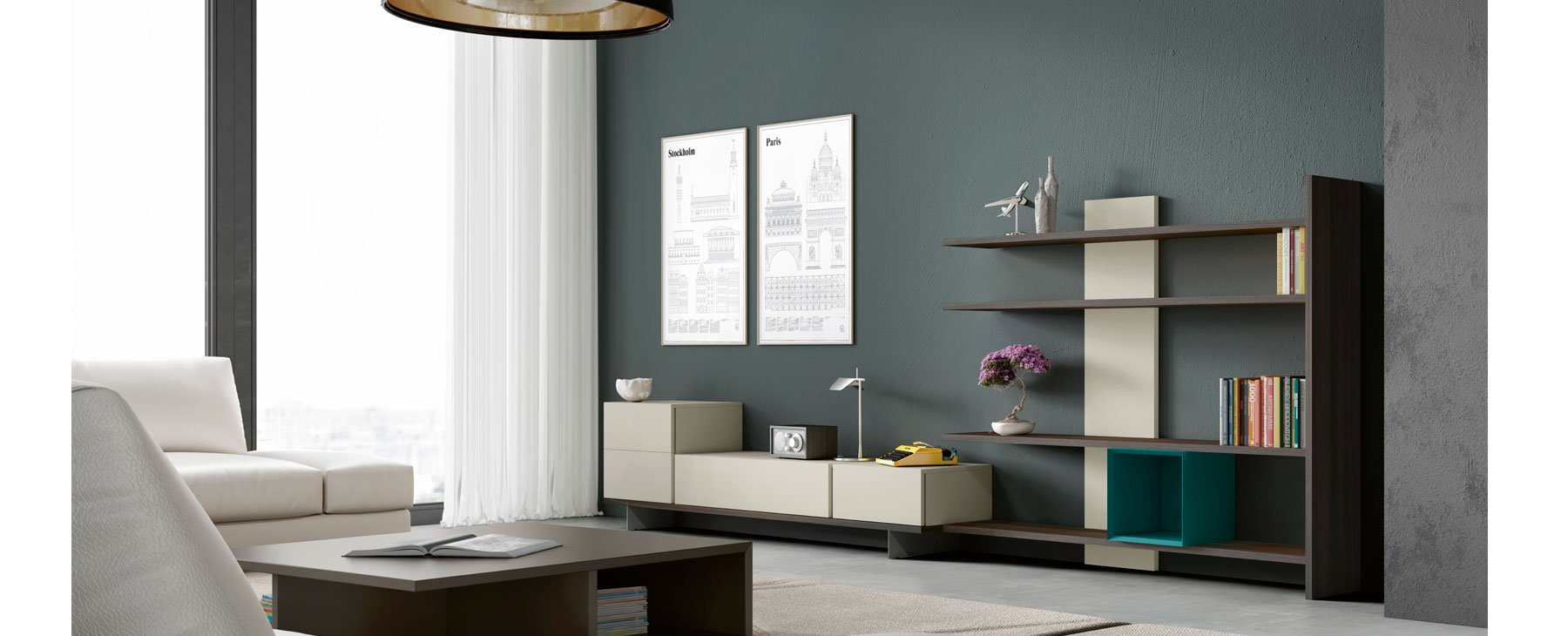 В этом случае книжный шкаф IRO сконфигурирован таким образом, что нет необходимости устанавливать вертикальную стойку. Уникальность этого книжного шкафа заключается в использовании только одной стойки и задней панели для достижения жесткости, необходимой для выдерживания большого веса. Такая композиция идеально подходит в качестве решения для хранения мультимедиа. Таким образом, книжный шкаф становится единым целым с другой мебелью.